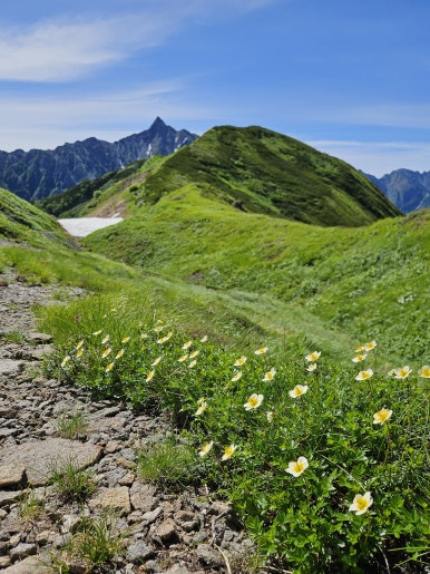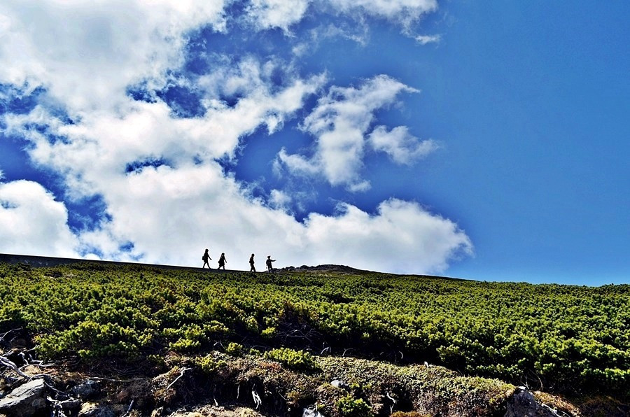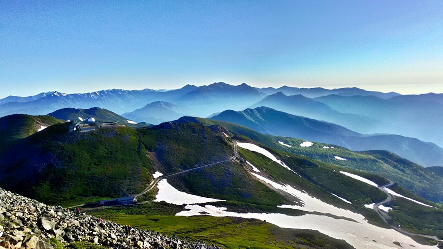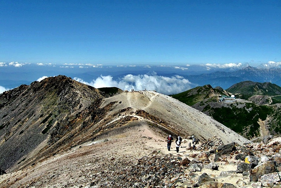 능선이 완만해서 파노라마처럼 펼쳐지는북알프스 풍광을 조망하면서 여유롭게 오를 수 있다