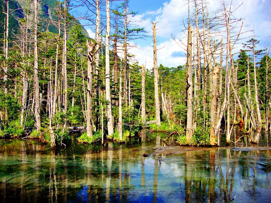 원시 상태의 호수와 숲, 만년설로 덥혀있는 북알프스 연봉을 조망할 수 있는 아름다운 계곡이며..