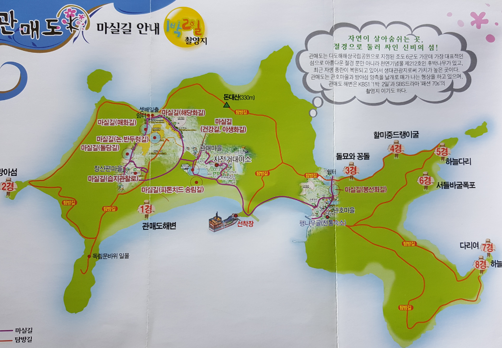 | ◎여행일정 : 첫날= #400년 천연기념물 수동리팽나무 #고창의맛 참게정식(참게장에 양파, 참기름, 참깨, 청양고추 양념이 어우러진 정식) #녹차밭과 호수가 있는 뷰카페 "연다원" #고창 청보리밭죽제 메밀꽃(학원농장) #오월에 내리는 하얀 눈꽃 이팝나무 #트윈룸 호텔숙소 이동 룸배정후 자유시간 둘째날=조식후 집결(조식제공) #팽목항 조도행 배승선 출발 #조도 창유항 도착 #진행버스로 섬투어 #관매도행 여객선승선 #관매도 도착 룸배정후 관매도8경중 3~6경 트레킹&자유시간 셋째날=조식후 집결(조식제공) #관매도 1경~8경 트레킹&산행 #관매도 배승선 출발 #팽목항 도착 #버스 탑승 서울상경 (일정및 코스는 당일 상황에 따라 변경 될수 있습니다) |