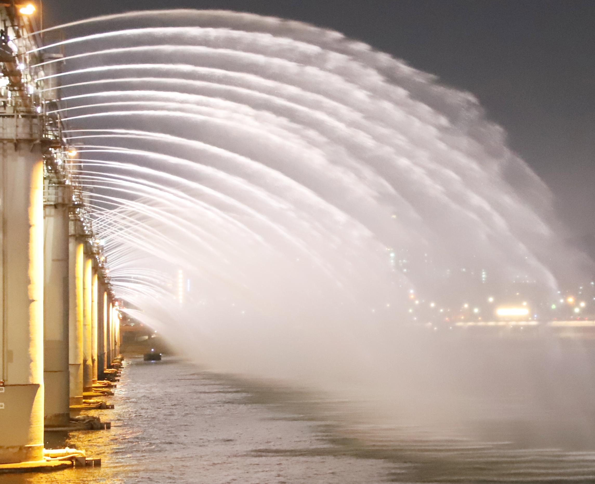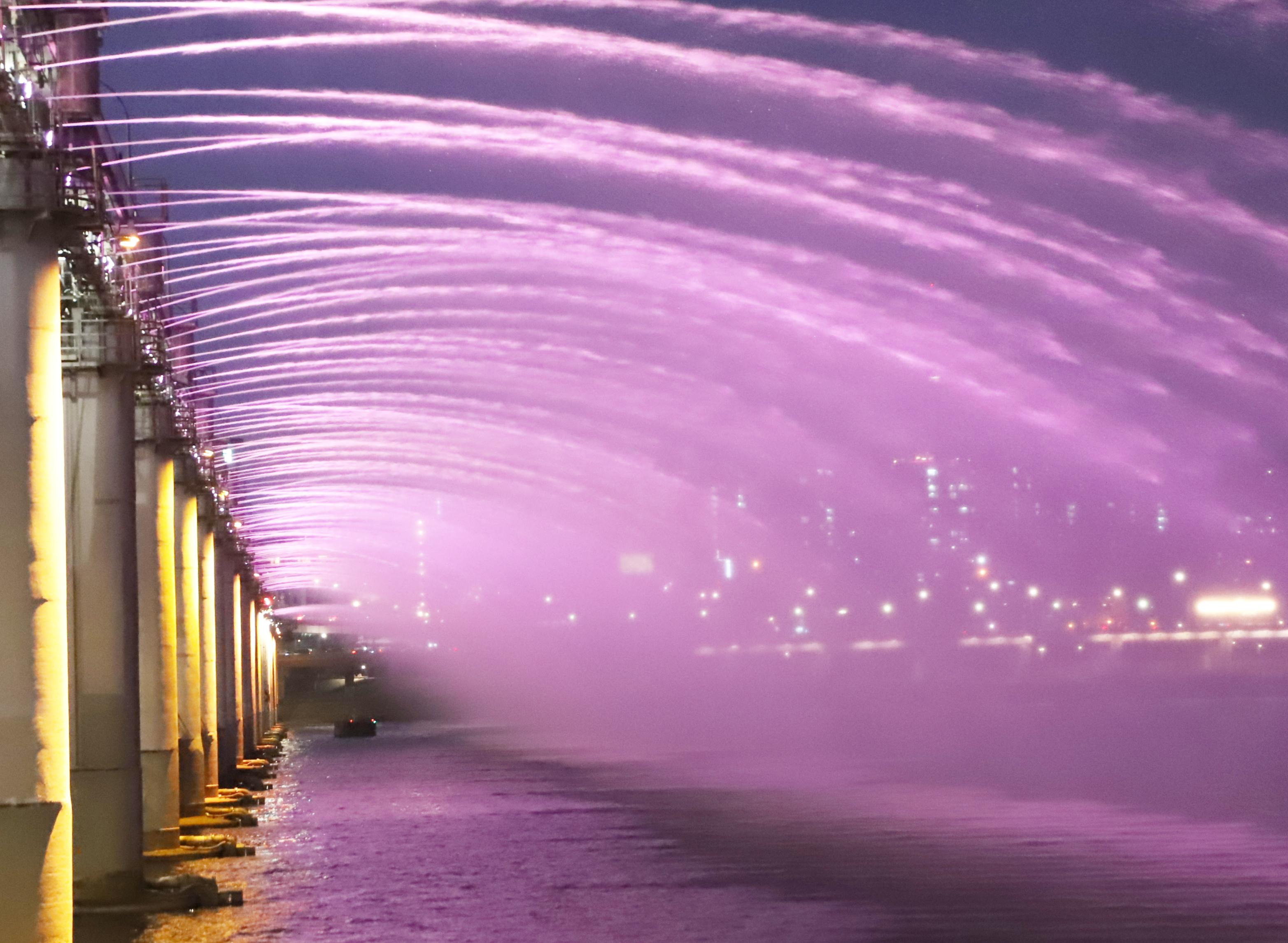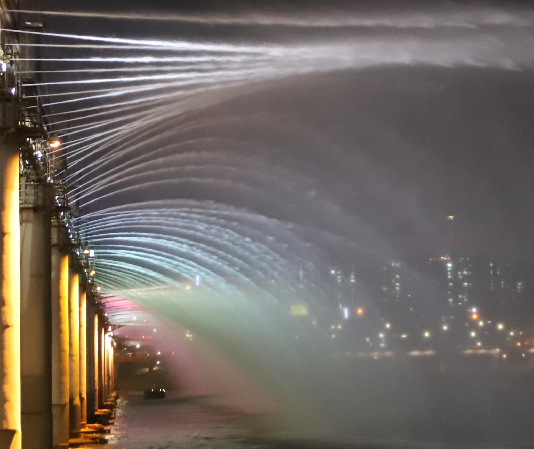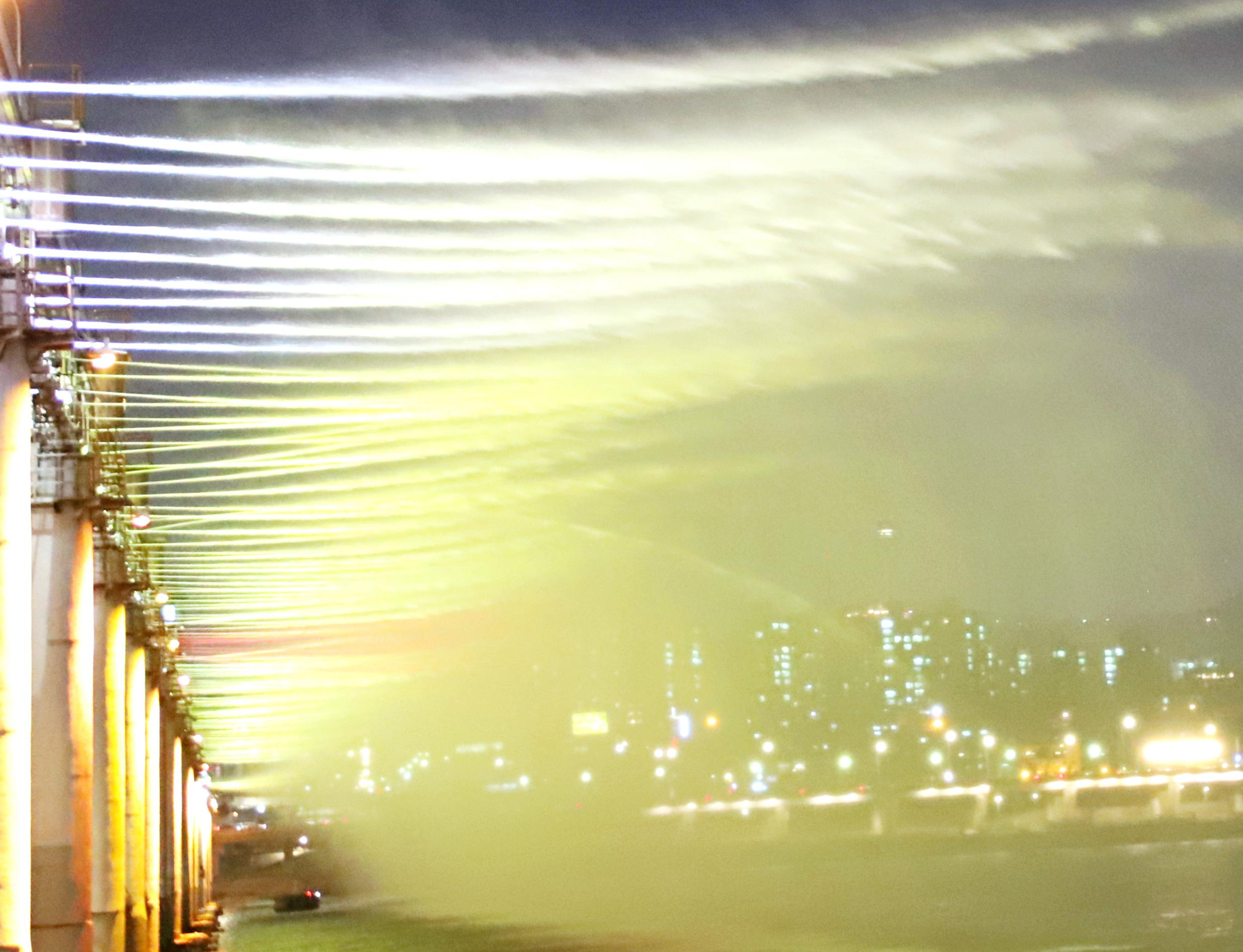 작성자좌청룡. 작성시간 26.03.22 위에 다리는 반포대교 밑에 다리는 잠수교 위에 반포대교 에서 분수 처럼 물을 뿌리면서 조명을 비취니까 오로라 처럼 보이는것 멋져부려요