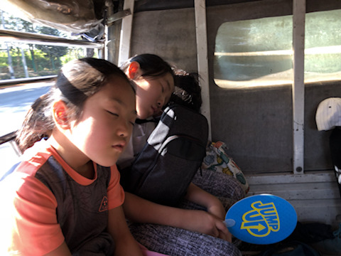 시끄러운 트럭버스에서도 잘 자는 우리 아이들