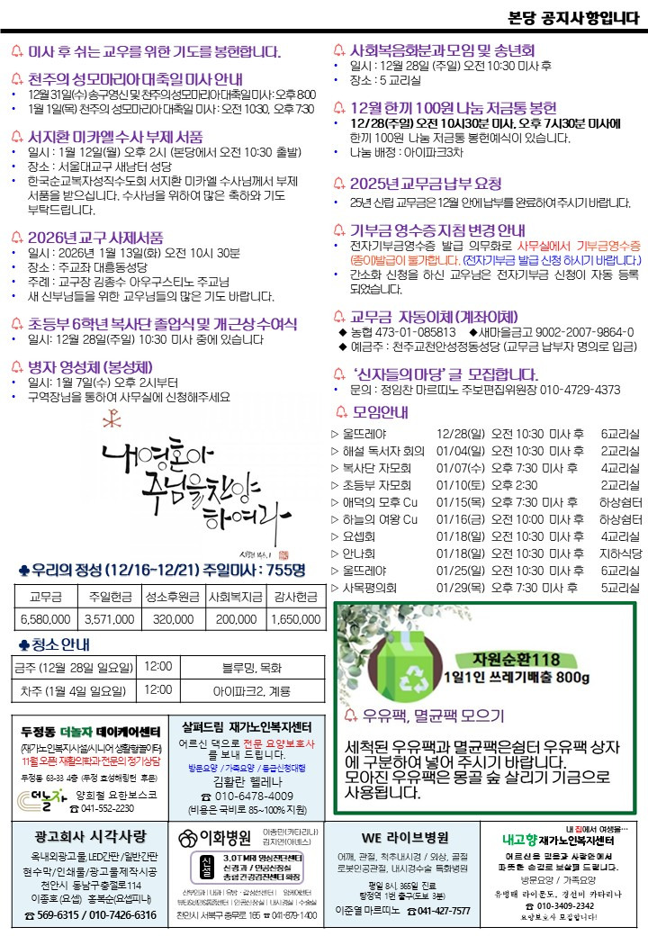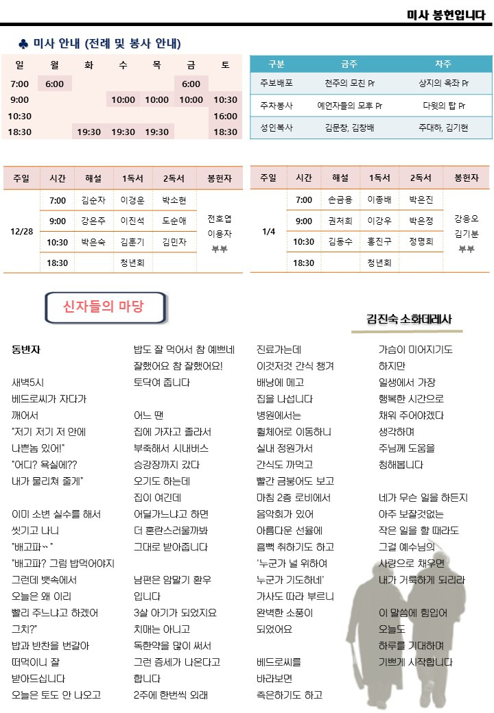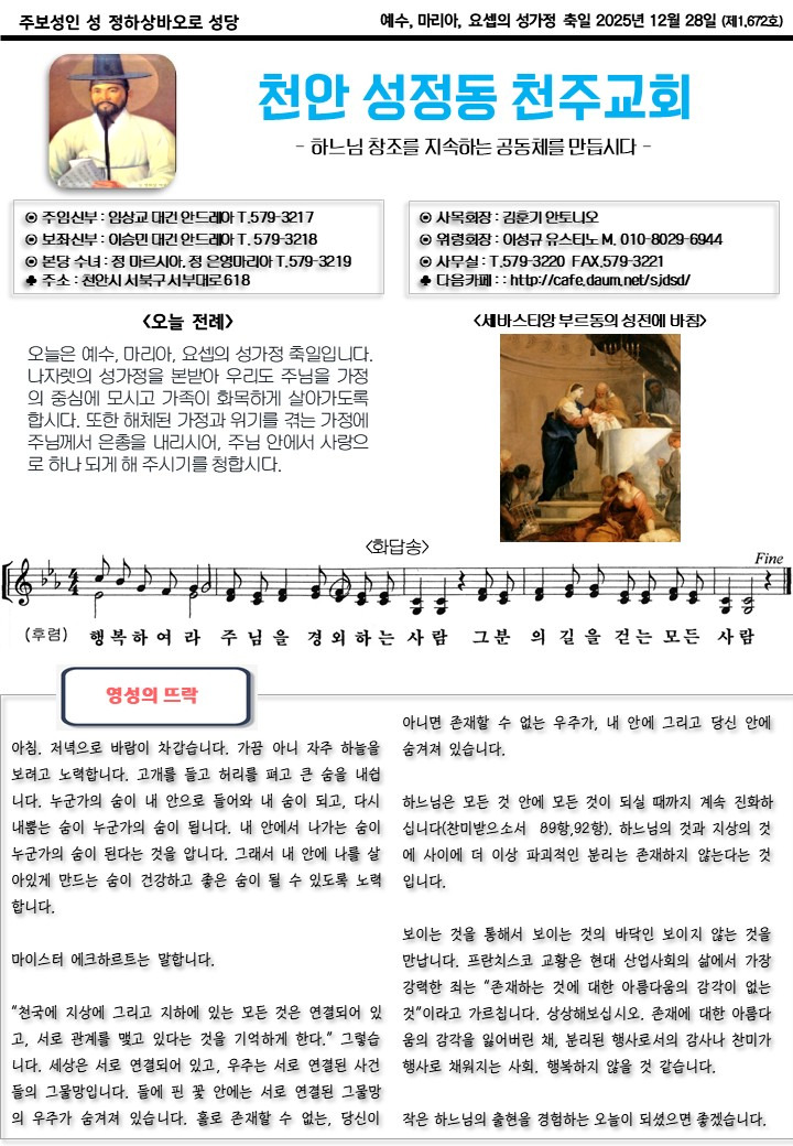 2025년 12월 28일 예수 마리아 요셉의 성가정 축일 작성자사무장|작성시간25.12.27|조회수60 목록 댓글 0 글자크기 작게가 글자크기 크게가 251228 예수 마리아 요셉의 성가정 축일(완).pdf1.13MB 첨부파일첨부된 파일이 5개 있습니다. etc 파일 슬라이드2.JPG 다운로드 etc 파일 슬라이드3.JPG 다운로드 etc 파일 슬라이드4.JPG 다운로드 etc 파일 슬라이드1.JPG 다운로드 pdf 파일 251228 예수 마리아 요셉의 성가정 축일(완).pdf 다운로드 다음검색 현재 게시글 추가 기능 열기 북마크 공유하기 신고 센터로 신고 댓글 댓글 0 댓글쓰기 답글쓰기 댓글 리스트