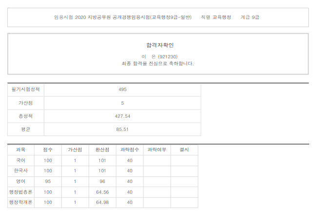 저는 공부를 본격적으로 시작한 순간부터 선재쌤을 의지하면서 공부했기 때문에 꼭 합격수기를 쓰고 싶었는데,, 쓰는 순간이 왔네요. 선생님 덕분에 이번에 2020년도 지방직 교육행정 최합(사진인증), 국가직 출관직 필합(면접포기)를 이룩하였습니다.