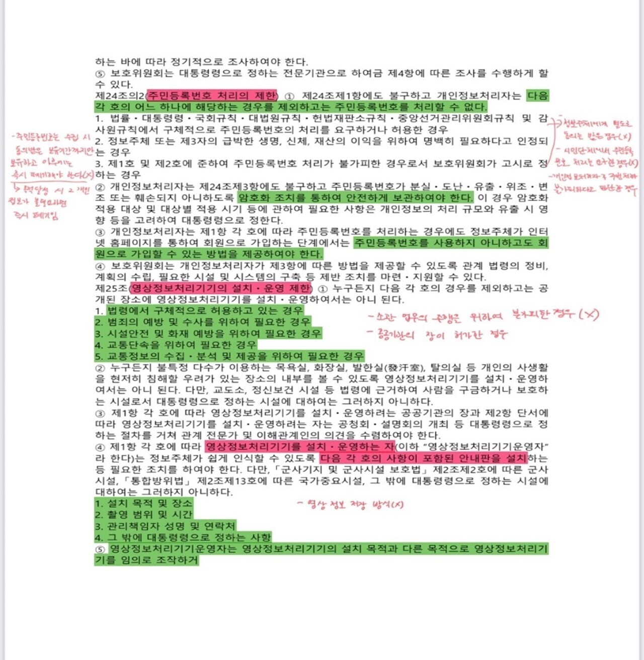 미진쌤이 자료실에 올려주신 법 파일에 문제로 나온 법 조항을 모두 표시하였고, 표시된 부분 위주로 회독하는 것만으로 공부했습니다. 아래 사진과 같이 기출 문제는 분홍색 형광펜, 선지는 초록색 형광펜, 틀린 선지로 나온 문장은 빨간색 펜으로 썼습니다.