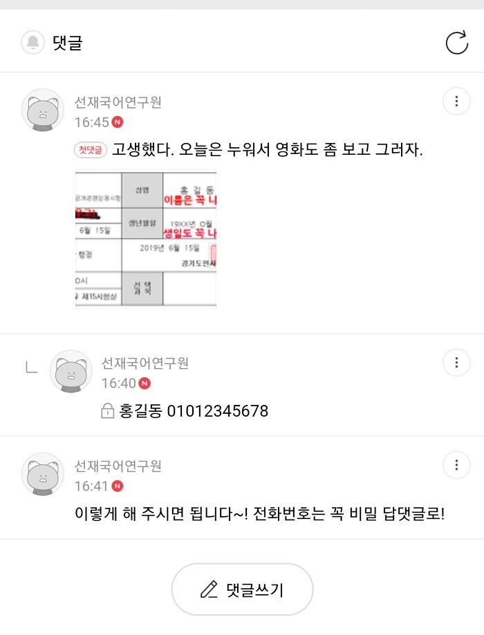 3. (중요) 성함과 핸드폰 번호를 비밀 답댓글로 올려주세요! 비밀 댓글은 자물쇠 아이콘을 누르면 됩니다. 성함과 폰 번호가 없으면 보내드릴 수가 없어요!