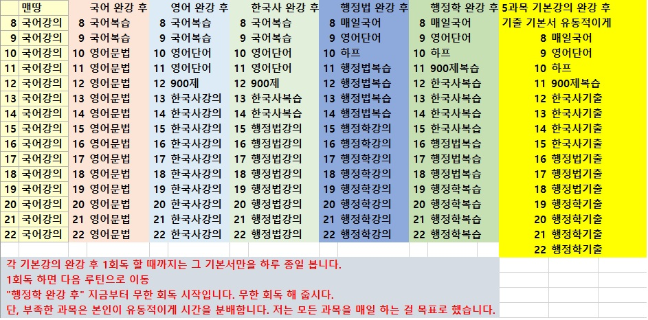 -> 08~10시 국어 기출 혹은 기본서 회독, 10시~13시 영어 문법900제 및 문법 회독 13시~ 15시 한국사 기출 및 기본서 회독, 16시~23시 행정법 강의, 행정법 완강 시 다음날부터 08시~23시 빠르게 1회독할 때까지 하루 중 행정학만 공부.