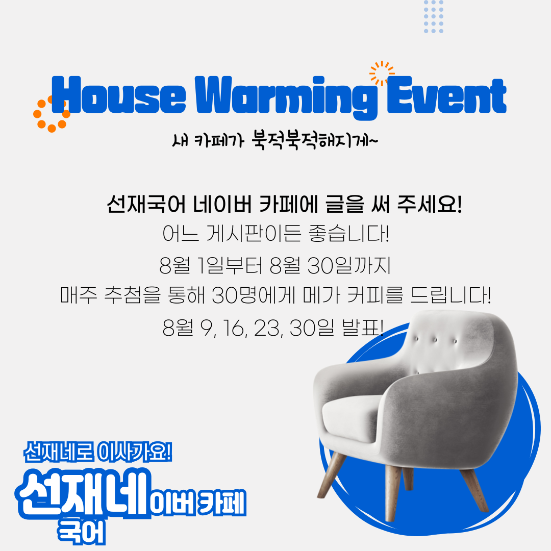 📢 네이버 카페 이전 이벤트 <이삿짐 나르기 이벤트>, <House Warming Event>도 많은 관심 부탁드립니다.