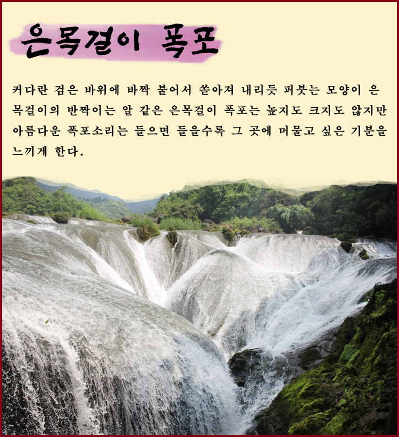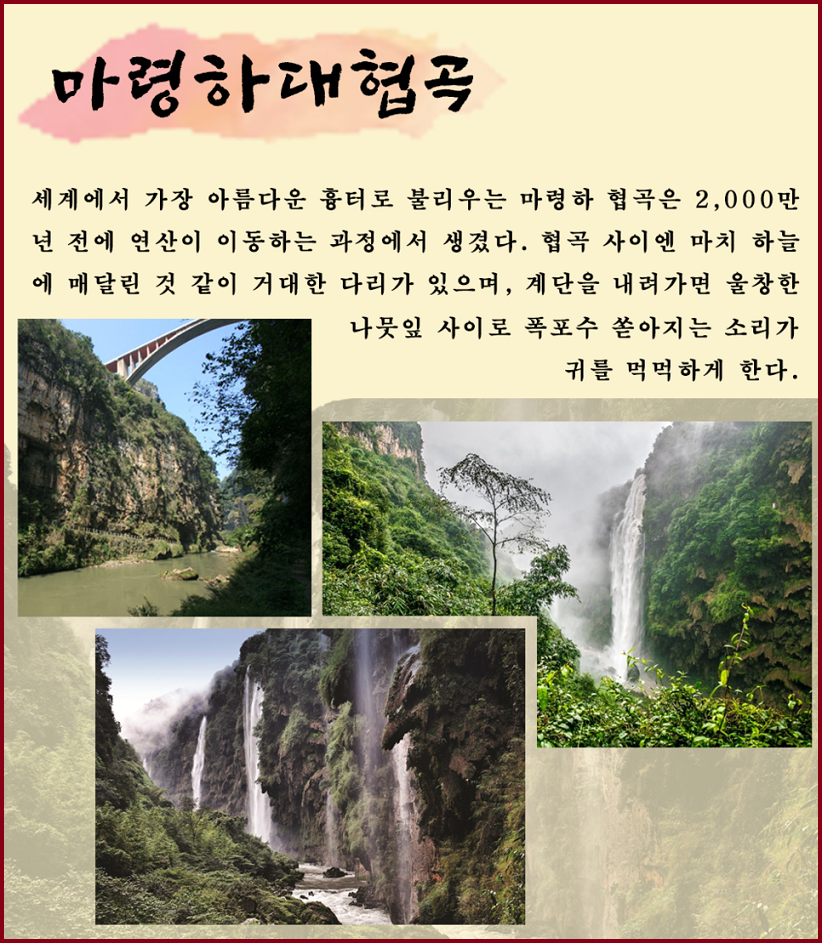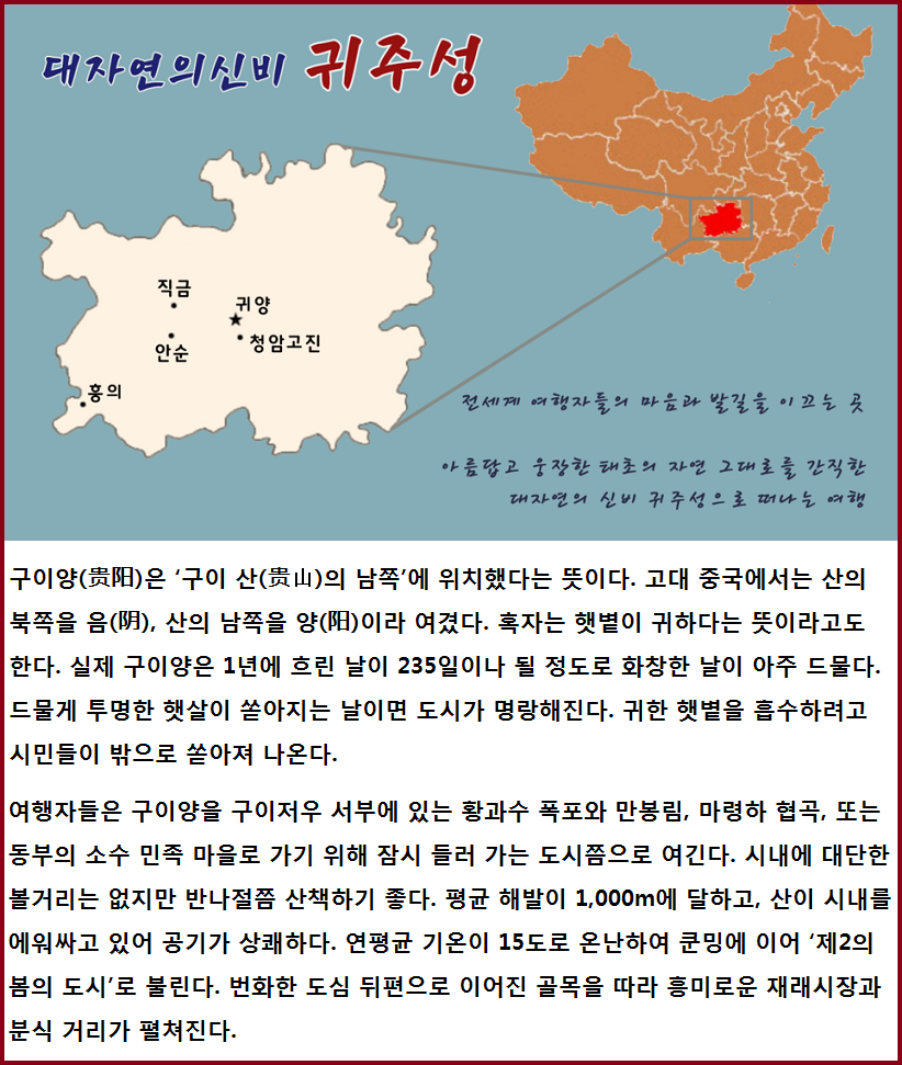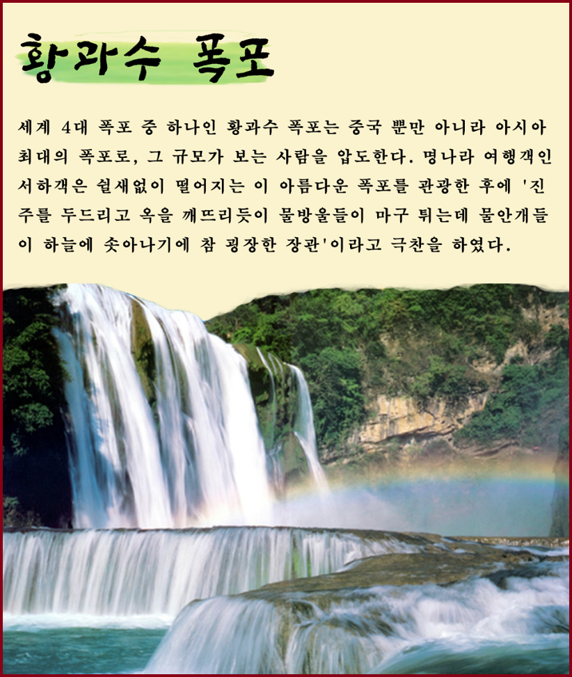 소 재 지 | 세계4대폭포인"황과수폭포" "묘족마을" "마령하협곡" "만복림" 등 신비의 세계 | |||||