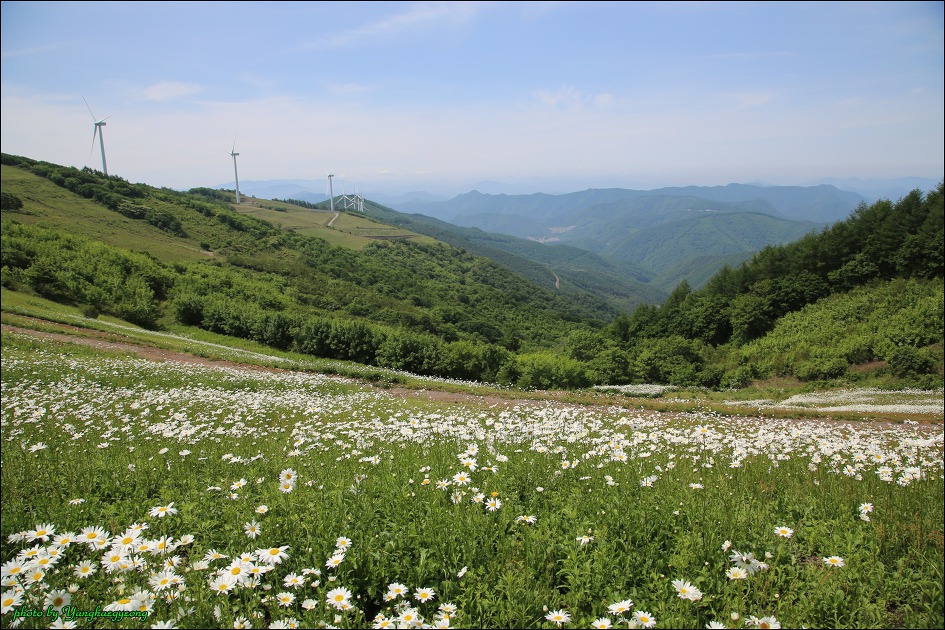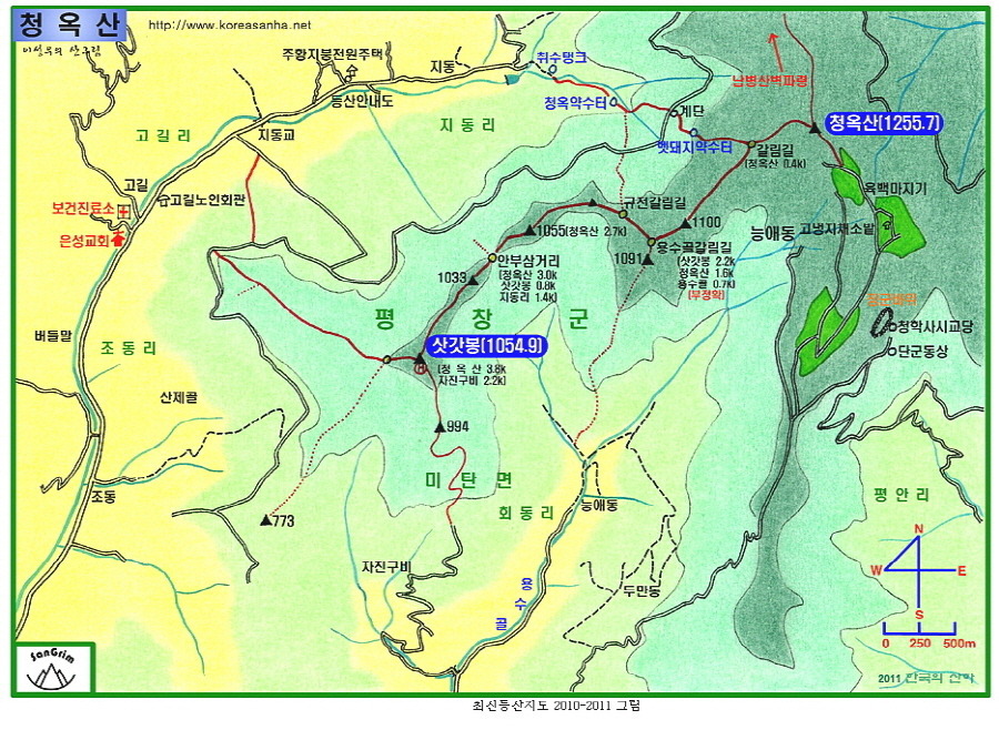 청옥산(1255,7m) 평창군 미탄면과 정선읍 경계에 위치한 청옥산 하면 먼저 두타산과 나란히 있는 동해 청옥산(1403.7m)이 있고, 또 태백산과 나란히 있는 경북 봉화군의 청옥산(1276.5m)이 있다. 그러나 강원 평창군에도 청옥산(1255.7m)은 5월 하순경~ 6월 초순경 이 산을 찾으면 산나물이 절정을 이루는, 그야말로 산나물이 전국에서 손꼽는 산이다. 즉 가리왕산의 서쪽에 위치한 전형적인 육산이다. 백두대간 오대산 비로봉과 계방산에서 가라왕산을 거쳐 강원 남부 내륙지방의 작은 봉우리로 이어지는 중간쯤에 위치한 광활한 면적을 자랑하는 산봉우리다. 백두대간에서 뻗어내린 산줄기는 청옥산 정상의 드넓은 벌판에서 잠시 호흡을 가다듬고 다시 삿갓봉과 남병산, 장암산으로 달려가고 다른 줄기는 삿갓봉에서 삼방산-절개산-거슬갑산-옥녀봉으로 이어져 평창강 주변의 평야에 다다른다 해발 1,255m의 청옥산은 "곤드레" 나물을 비롯해 산나물이 많이 자생한다. 능선이 비교적 평탄한 지형으로 산 정상에는 벼 육백가마니가 나올 정도로 넓은 분지가 소재하고 있는데, 이와 관련하여 일명 "육백마지기"라 불리기도 하는데 고랭지 채소를 주로 재배하고 있다. 이곳에서 재배되는 중갈이 무는 그 맛이 배 맛 같이 달다고 할 정도. 매년 봄이면 청옥산에서는 다양한 산나물을 직접 채취하면서 계절을 느낄 수 있다. 산정상까지 도로가 나 있어 차량으로 올라갈 수 있는데 미탄면 회동2리에서 청옥산 정상을 지나 평안2리로 내려오면 된다. 급경사 등이 별로 없기 때문에 등산에 큰 무리가 없다. 청옥산에서 발원한 물이 모이는 용수골계곡은 청옥산의 능선이 모여 형성된 울창한 원시림으로 형성되어 있고 1급수 어종인 둑중개(뚜구리)가 서식하고 있으며 사계절 경관이 뛰어나 여름철 많은 피서객이 찾는 곳이기도 하다. 또한 청옥산 남서방향에 위치한 삿갓봉은 높이가 1,055m로 그 모양이 삿갓을 엎어 놓은 것 같다고 하여 지어진 이름으로 조선시대 대동여지도에는 두만산(斗漫산)이라 표기되어 있다. | ||||||