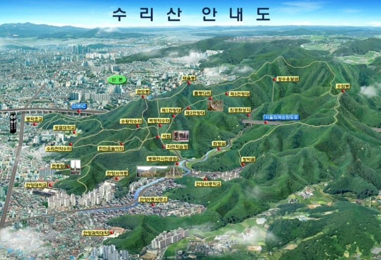 | 수리산[ 修理山 ] 489m 높이 489m이며 견불산(見佛山)이라고도 한다. 수리산은 한강 남쪽에서 서울을 감싸고 있으며 남북으로 능선이 길게 뻗어 있다. 정상에서 능선을 따라 독수리 모양의 수암봉(秀巖峰:395m)으로 연결되어 있다. 산으로 오르는 길은 바위가 많고 봄이되면 진달래가 붉게 물들어 많은 산악인들이 모여든다. 수리산 자락에는 맑은 물이 솟아나는 약수터가 많고 상연사, 용진사, 수리사 등의 사찰이 있다. 2009년에 경기도에서 도립공원으로 지정하여 도립공원 면적은 6.97㎢(군포시 4.3㎢, 안양시 안양동 관내 2.55㎢, 안산시 상록구 수암동 관내 0.12㎢)이다. |