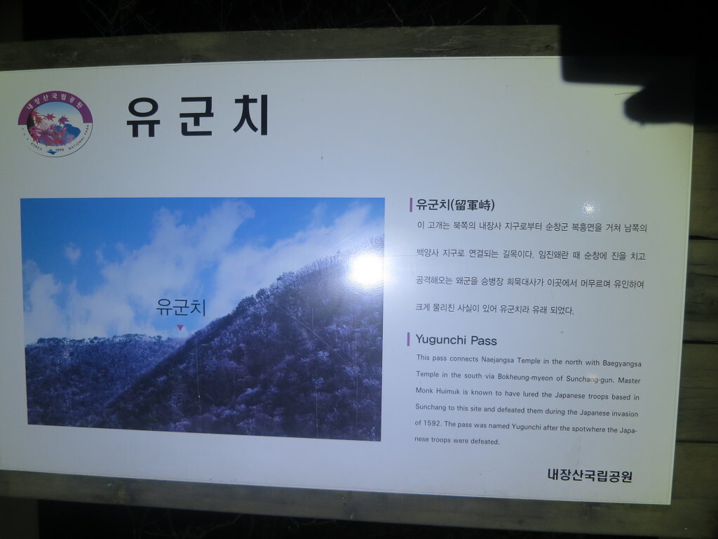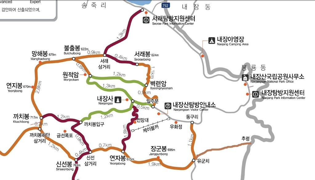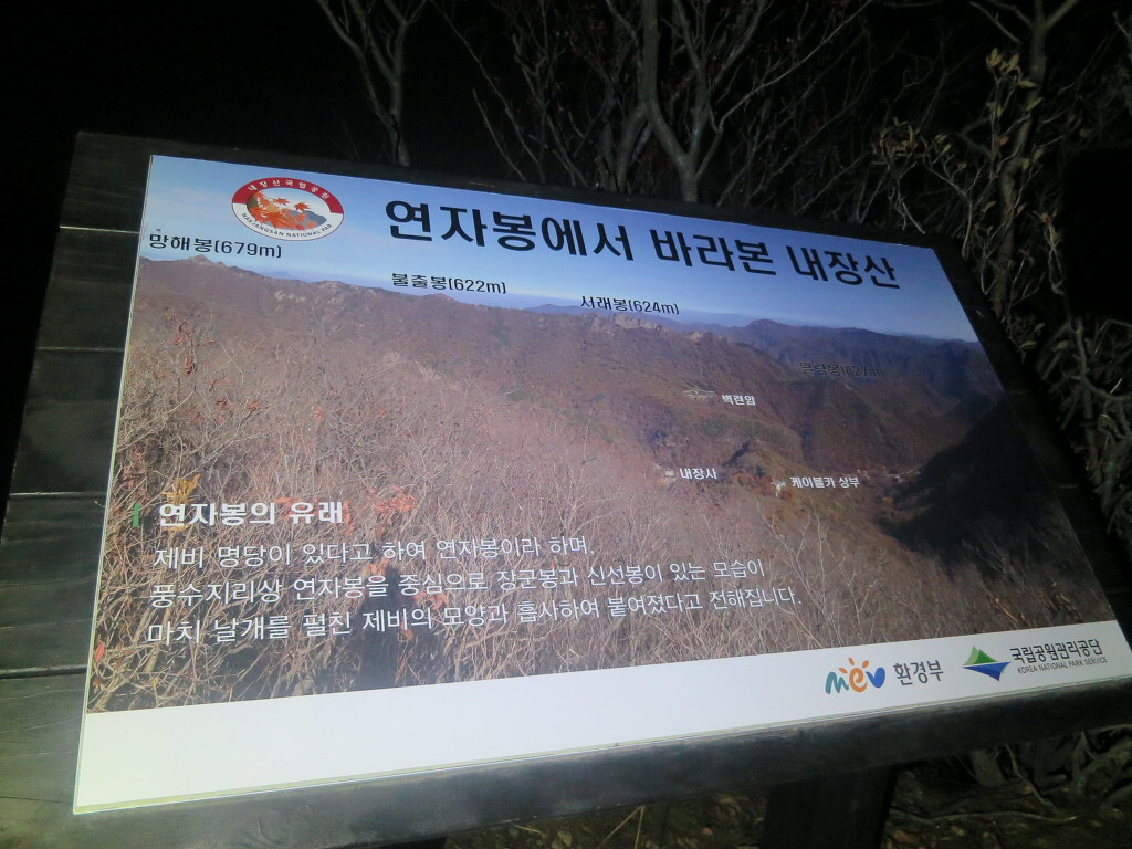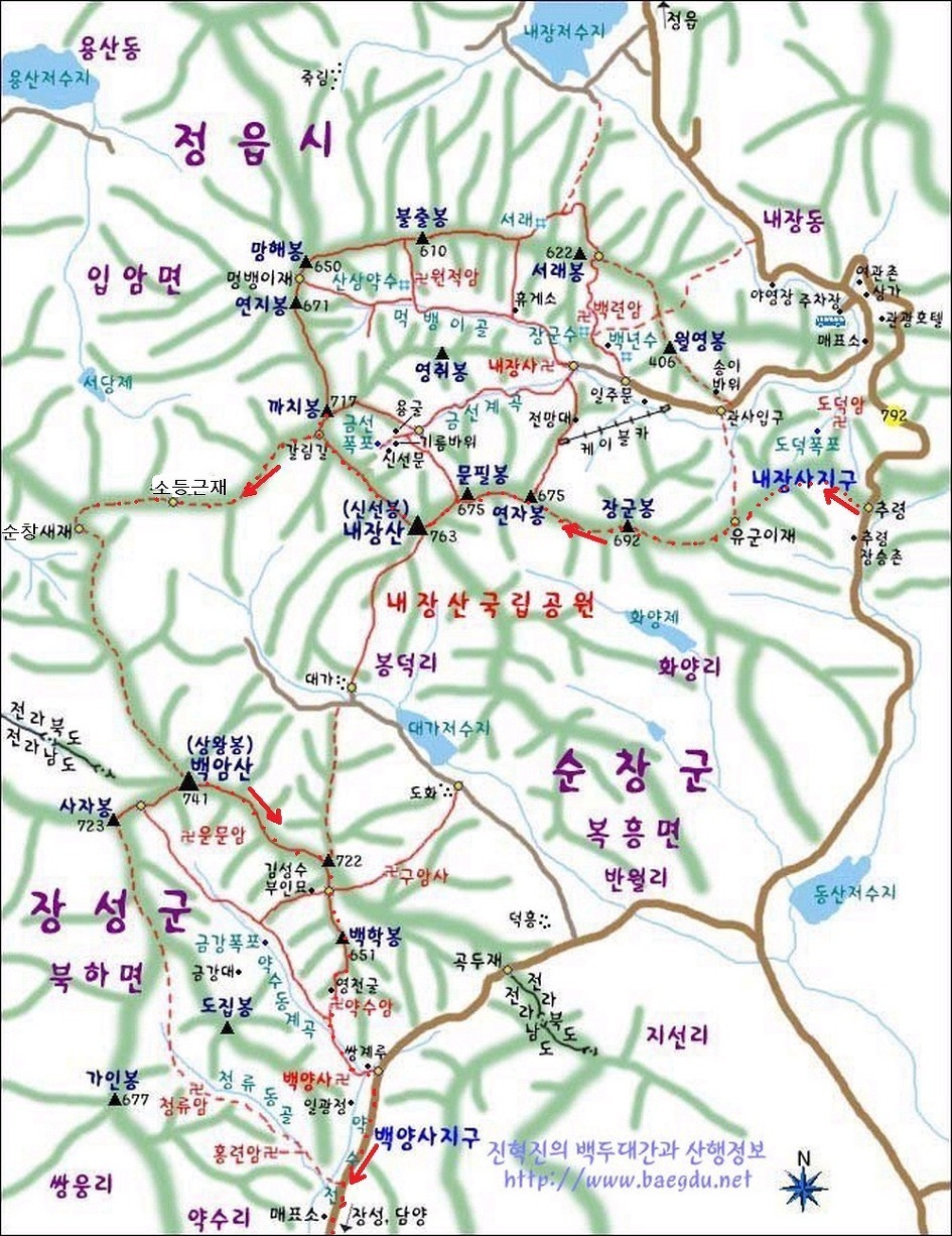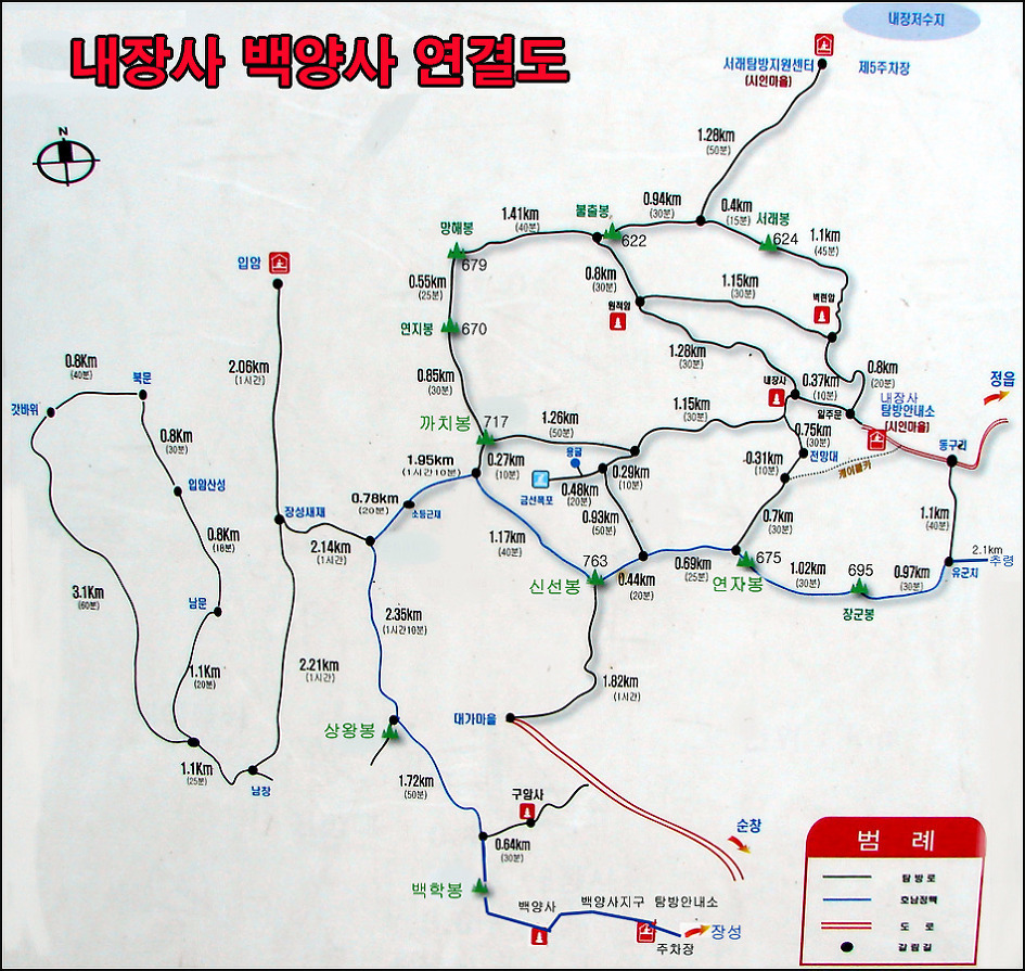 | 산행코스 | A코스: 추령~유군치~장군봉~연자봉~신선봉(내장산)~까치봉~연지봉~망해봉~불출봉~내장사 ( 약16킬로, 산행시간 6시간 30분 ) B코스: 백양사~백학봉~상왕봉~사자봉~옹달샘갈림길~청류암~가인마을~주차장 ( 약10킬로, 산행시간 4시간 ) | |||||