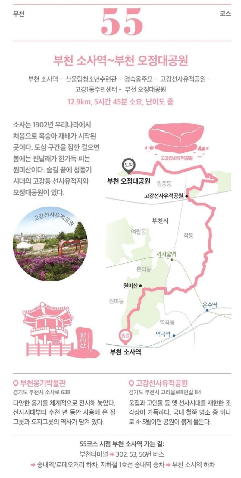 | 산 행 코 스 | 코스 : 부천소사역~원미산(167m)~산울림청소년수련관~고강선사유적공원~부천오정대공원~두리나루. 18Km 6시간(자유식 포함 천천히) | |||