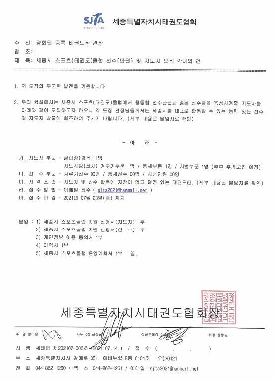 저희 협회 세종시스포츠클럽 선수 및 지도자를 다양한 분야(겨루기, 품새, 시범)로 지원 받고자 합니다.