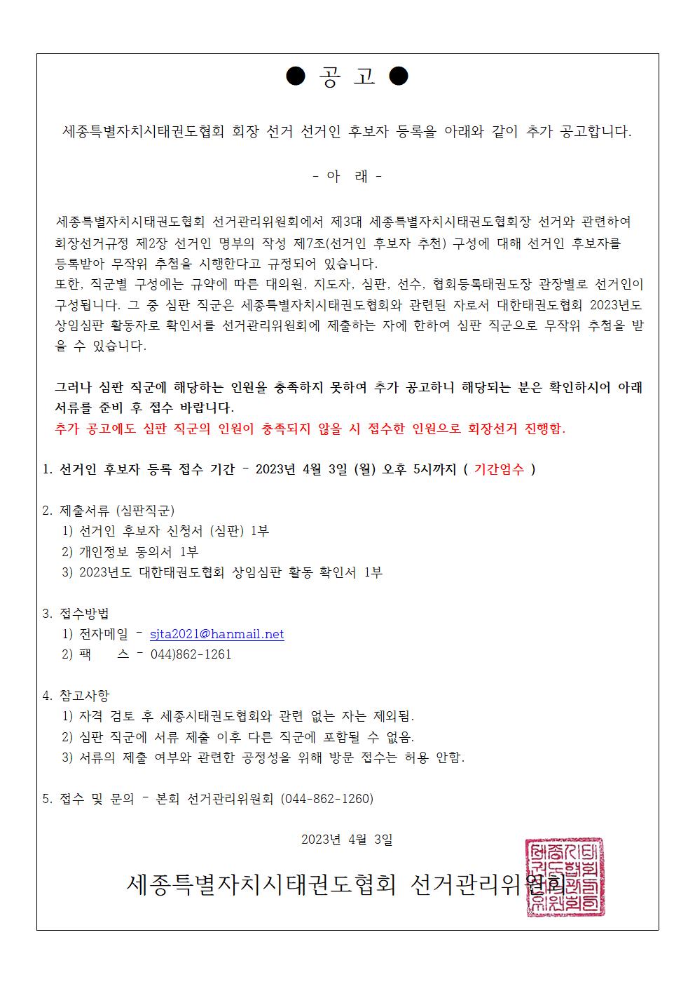 *세종특별자치시태권도협회 회장 선거 선거인 후보자(심판) 등록을 추가 공고합니다.