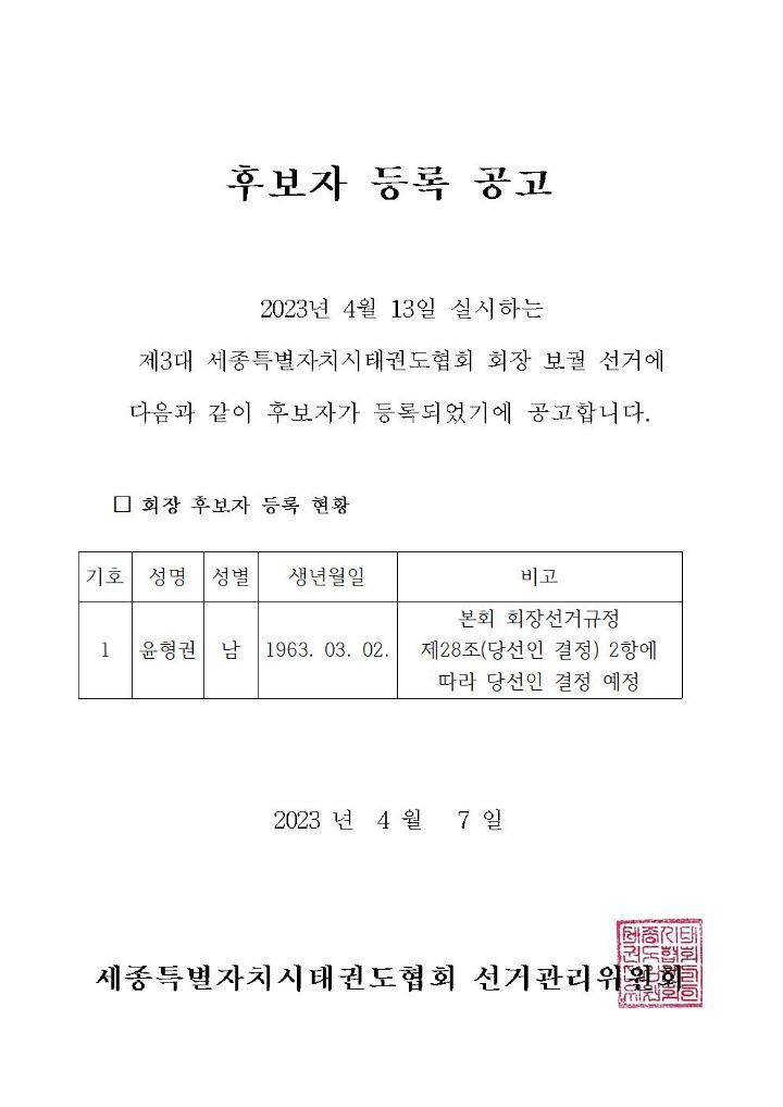 제3대 세종특별자치시태권도협회 회장 보궐선거 후보자 등록 공고) 작성자세종시태권도협회|작성시간23.04.07|조회수83 목록 댓글 0 글자크기 작게가 글자크기 크게가 본회 회장 보궐 선거 후보자 등록 명단을 아래와 같이 공고합니다. 다음검색 현재 게시글 추가 기능 열기 북마크 공유하기 신고 센터로 신고 댓글 댓글 0 댓글쓰기 답글쓰기 댓글 리스트