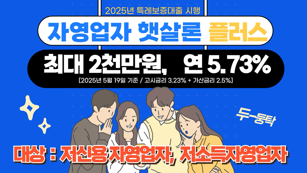 <유의사항>*가입전 상품설명서 및 약관 등 필독* 대출대상 : 연소득 3,500만원 이하 자영업자 또는 연소득 4,500만원 이하이며 개인신용평점 744점 이하 자영업자*대출상환 : 1년거치 4년원금균동분할상환 *대출금리 : 연 3.23% ~ 연 5.73% (2025.5.19. 현재 기준)
