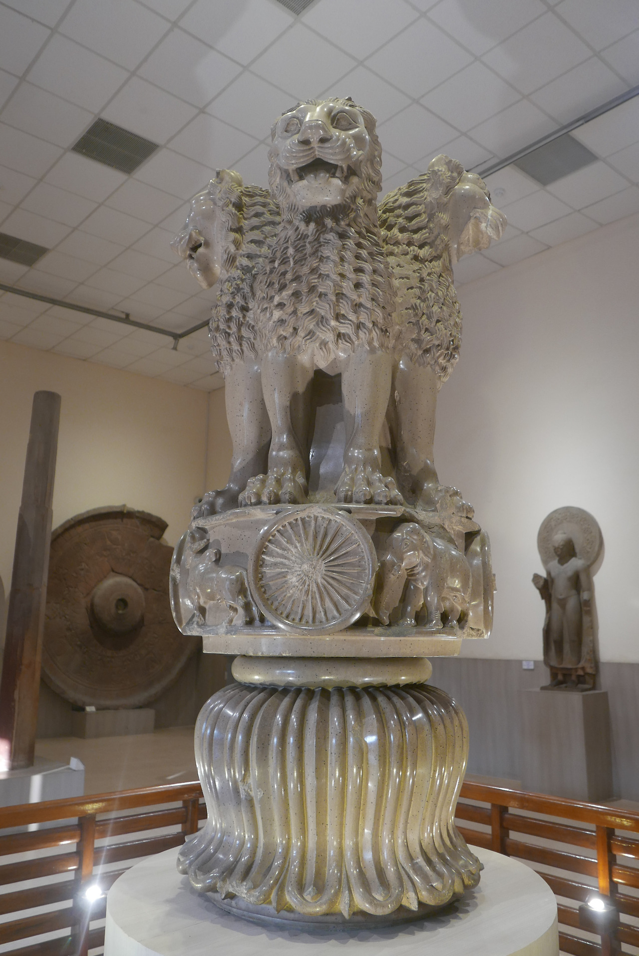 박물관에 전시된 단일 유물 중 가장 유명한 것은 사암(sandstone)으로 만들어진 '아소카 사자상(Lion Capital of Ashoka)'이다. 아소카는 마우리아 제국의 왕으로, 기원전 250년경 세워진 아소카 기둥(Ashoka Pillar)의 맨꼭대기에 장식되어 있던 조각상이다. 인도가 영국으로부터 독립하고 공화정을 선포한 1950년 제정된 인도 국장의 형상이 아소카 사자상이다.(두산백과)