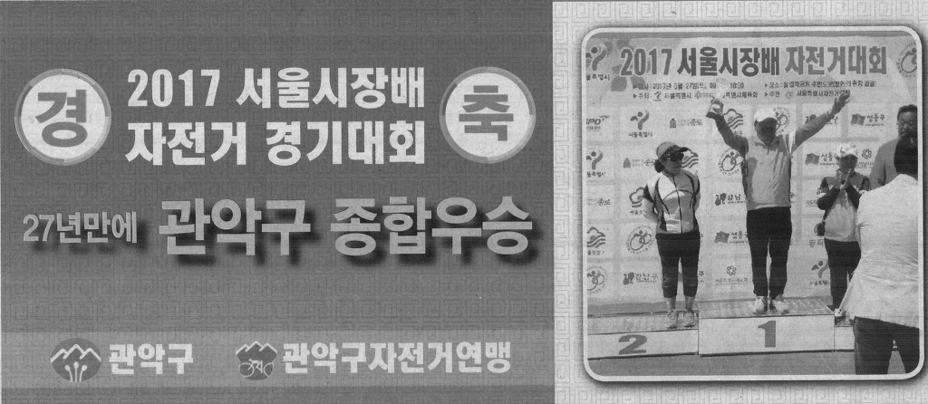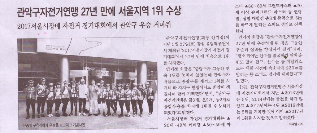관악구자전거연맹 27년만에 서울지역1위수상 2017.6.8.....관악저널 이복열기자 작성자고래님|작성시간17.07.01|조회수110 목록 댓글 0 글자크기 작게가 글자크기 크게가 다음검색 현재 게시글 추가 기능 열기 북마크 공유하기 신고 센터로 신고 댓글 댓글 0 댓글쓰기 답글쓰기 댓글 리스트