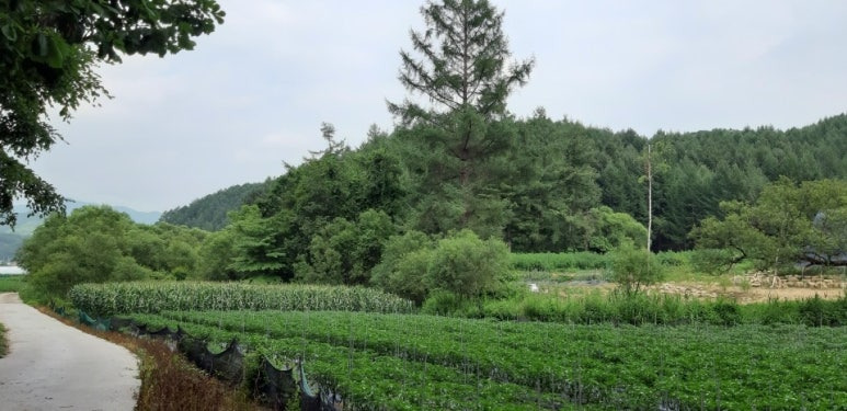 봉평 5분 막다른 길끝 숨은땅,앞은 잔잔한 소개울,뒤는 아늑한 야산