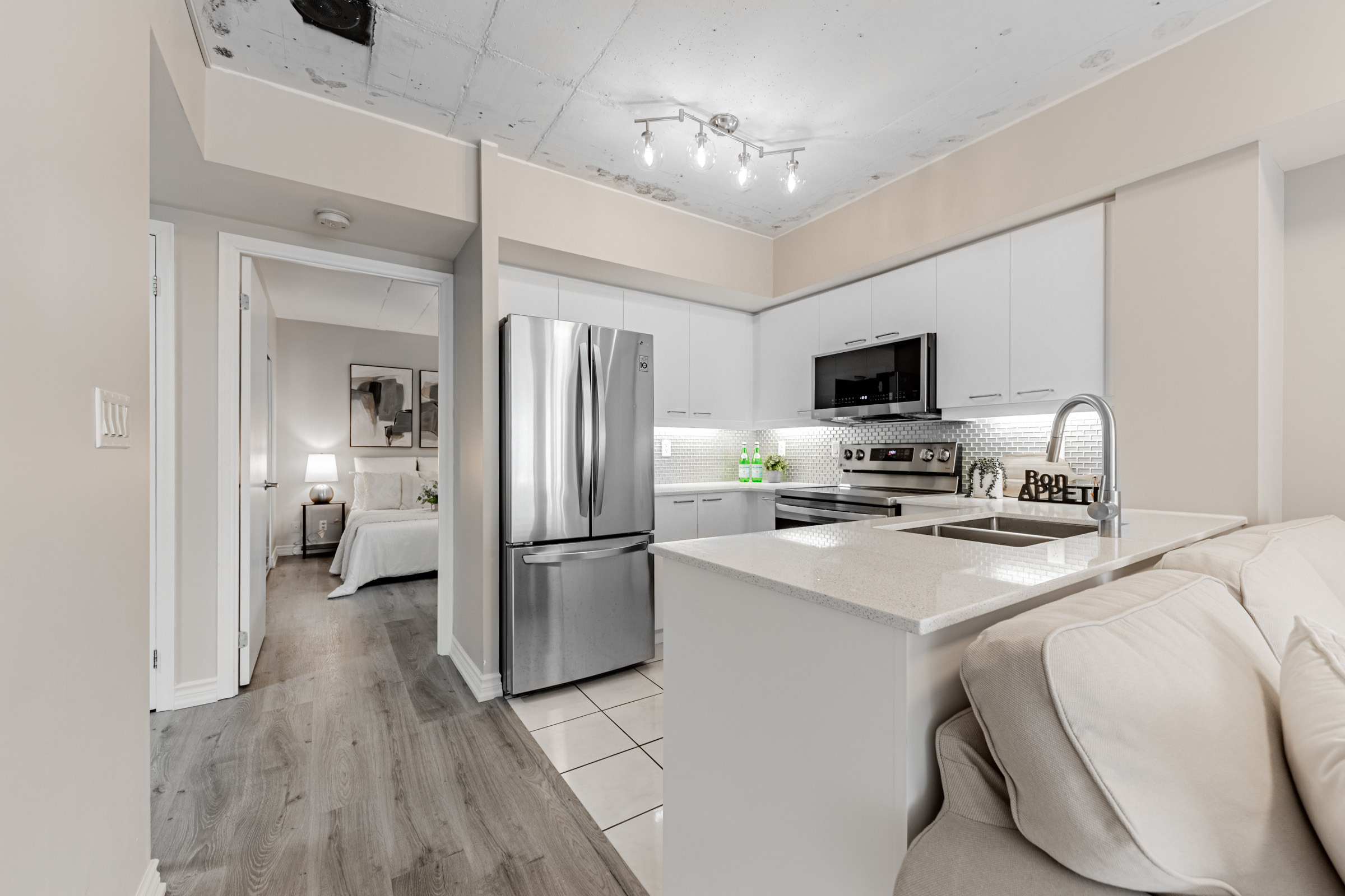 캐비넷은 화이트 랩 마감으로 정돈했으며,