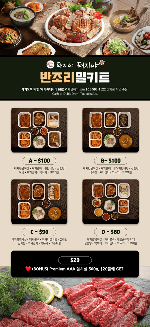 주문은 카톡 채널 ‘돼지야 돼지야 (쏜힐)’ or ‘piggysthornhill’ 로 오더 혹은 905-597-1522 로 전화주셔도 됩니다.