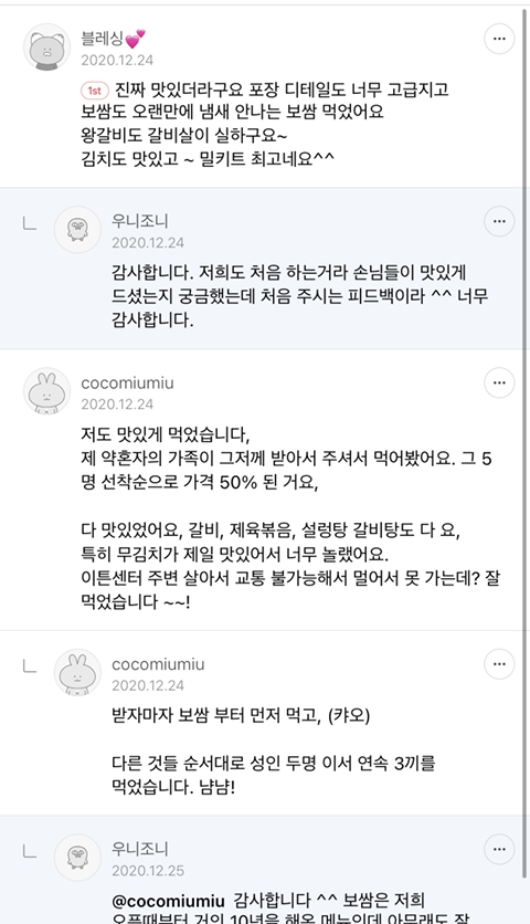 답댓글 작성자우니조니 작성자 본인 여부 작성자 작성시간 20.12.29 감사합니다 ㅎㅎ 맛있게 드셨다니 저희도 너무 기분이 좋네요. 이렇게 함든시기 도와주셔서 감사해요. 손님들의 귀중한 댓글 리뷰들이 큰 힘이 됩니다 😌