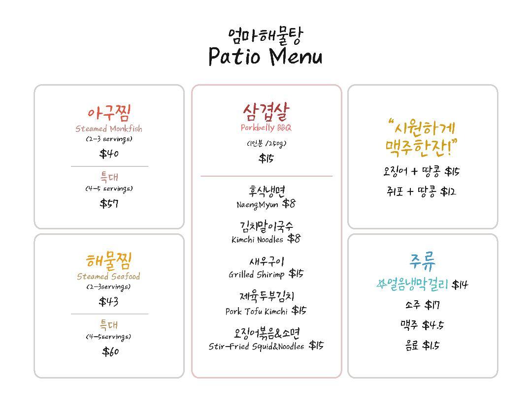 엄마해물탕에서 새로 구성된 Patio 메뉴를 야외에서 즐겨 보세요.