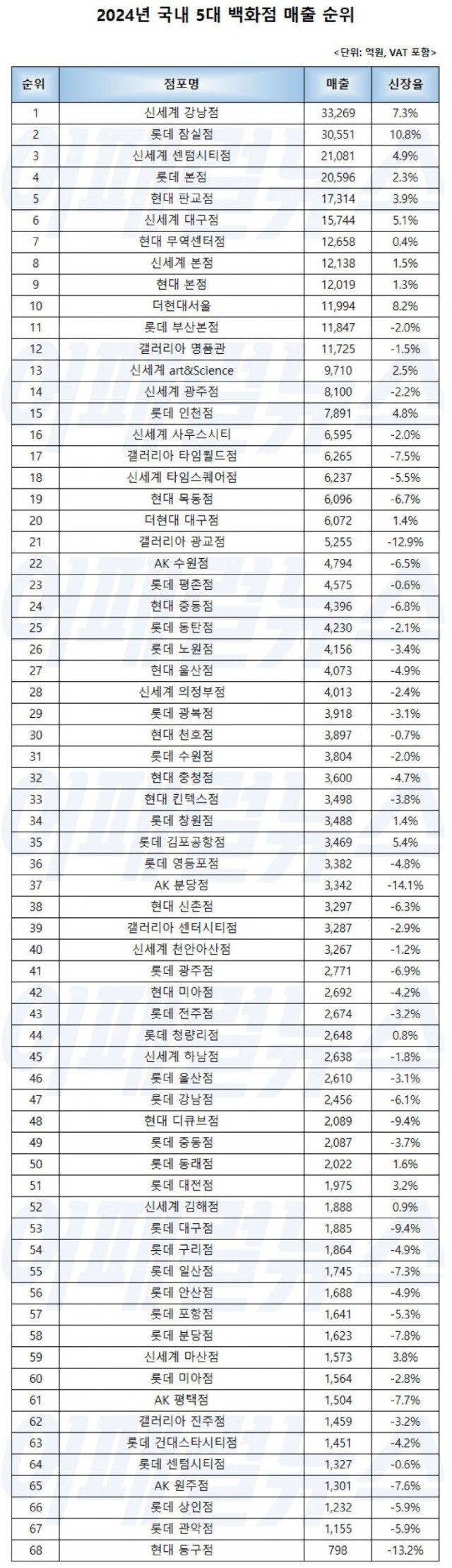 거래액 1조 이상 점포는 12곳으로 수도권 9개, 부산 2, 대구 1개...