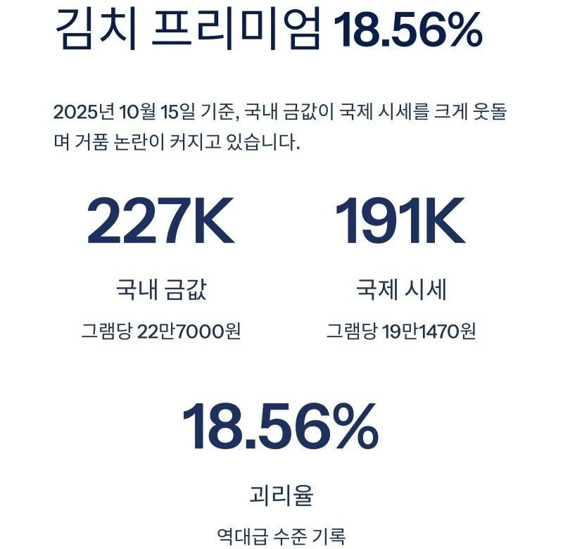 15일 국내 KRX g당 금 가격은 22만 7000원으로 국제 시장 19만 1470원에 비해 김치 프리미엄(괴리율)이 18.56%, 장중 한때 20%를 넘기도.