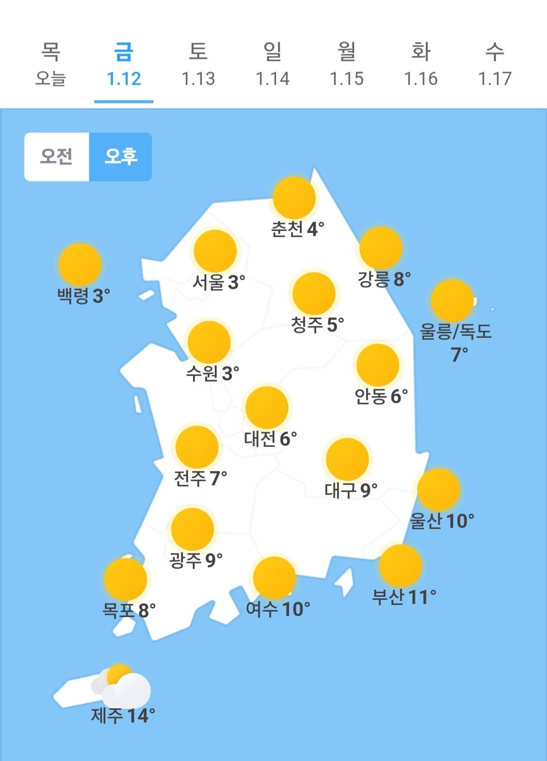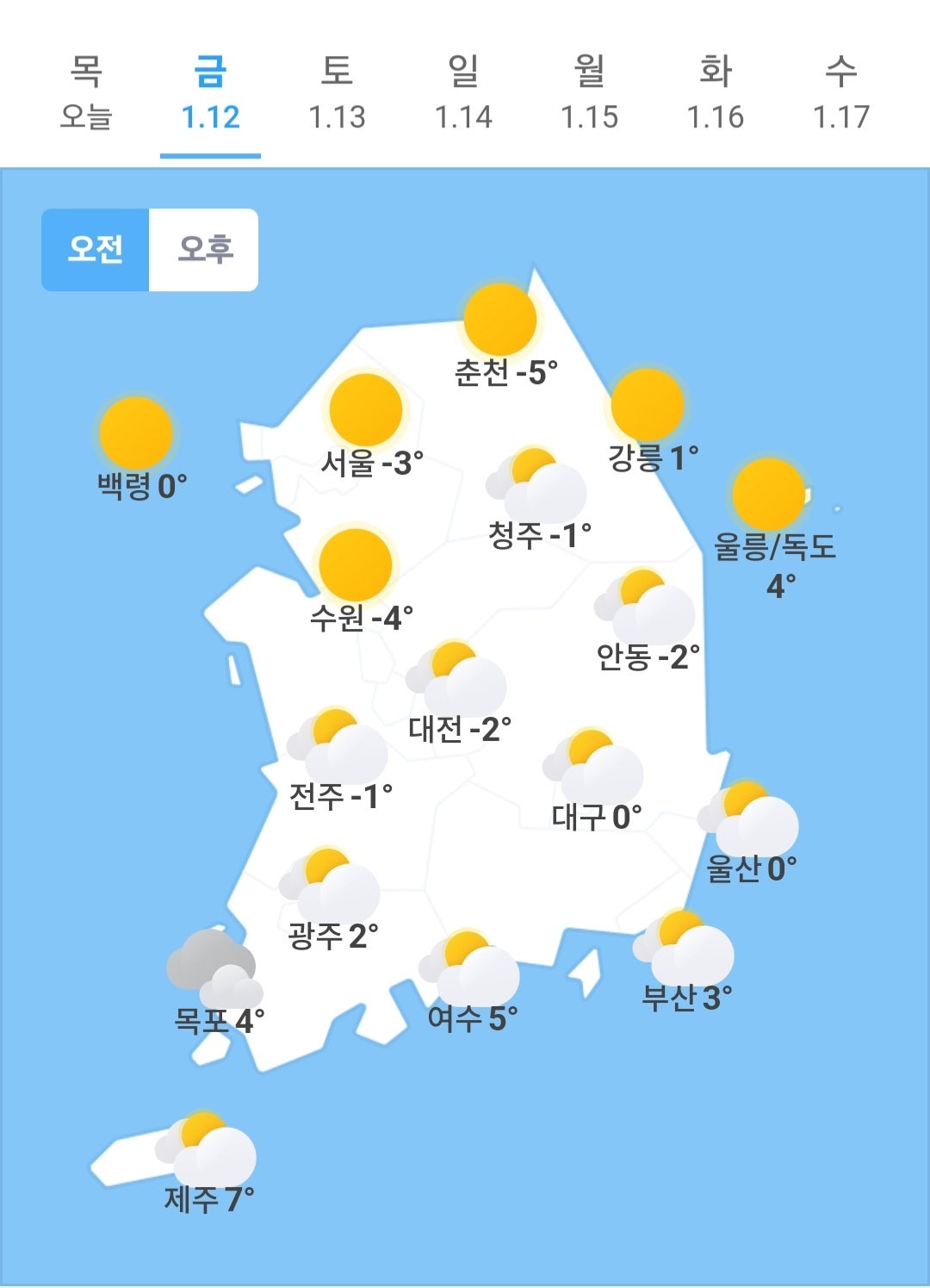 아침 최저 기온은 -7~4도, 낮 최고 기