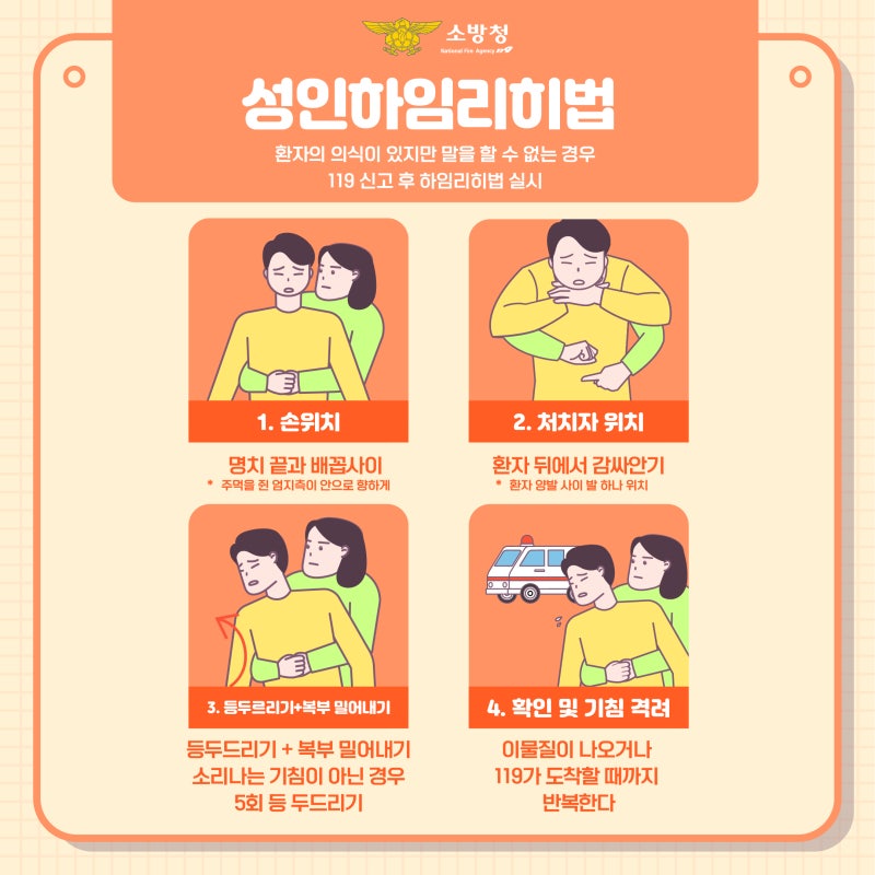 먼저 환자의 등 뒤에 서서 한 손은 주먹을 쥐고 한 손은 위에 겹친 후 배를 감싼다. 주먹 쥔 손을 배꼽과 명치 사이에 두고 배를 위로 쓸어 올리듯 강하게 밀어 올려야 한다.