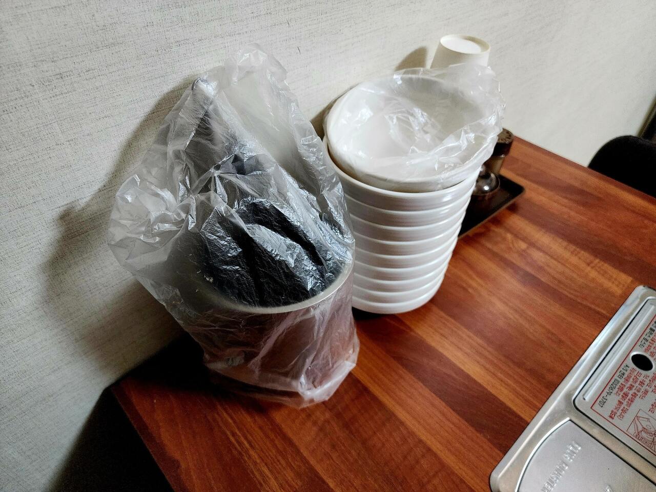 테이블마다 집기와 앞접시에 비닐봉투를 씌웠습니다ᆢ