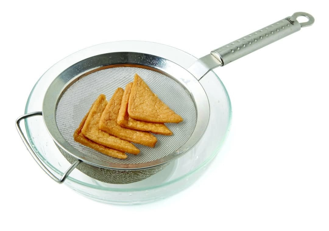 2. 유부는 체에 밭친 뒤 지그시 눌러 물기를 빼고,