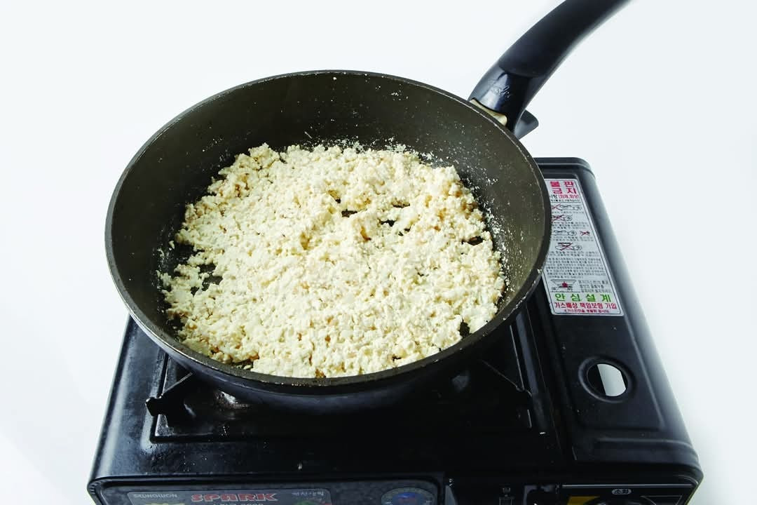 3. 약한 불로 달군 마른 팬에 으깬 두부를 3분간 볶아 물기를 날리고,