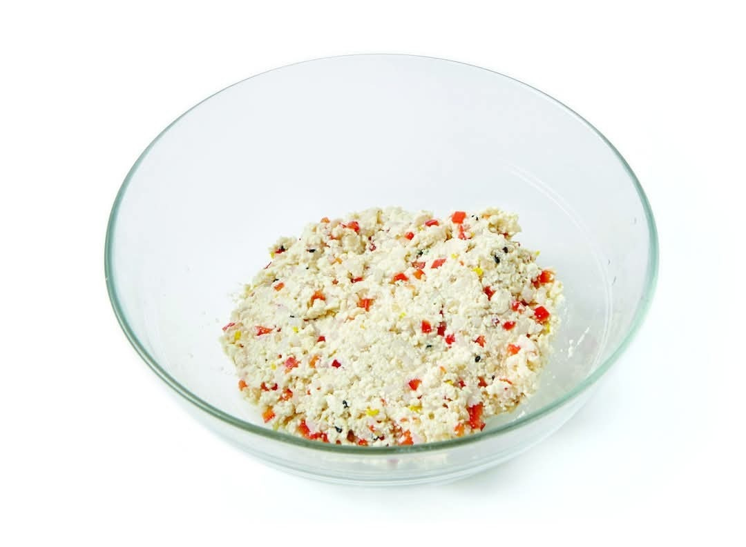 1. 두부는 체에 밭쳐 물기를 뺀 뒤 칼등으로 으깨고, 파프리카는 잘게 다지고,