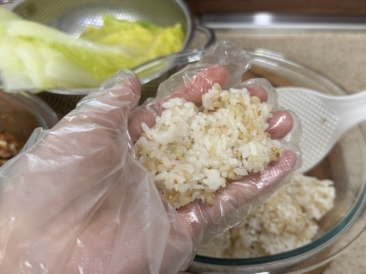 밥을 1.5T 정도 떠올려 납작하게 눌러주고