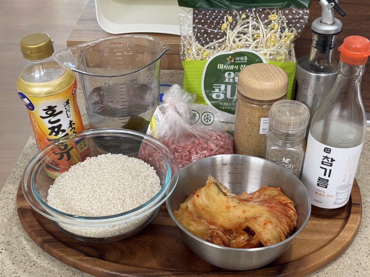 쌀 3컵, 소고기 300g, 김치 250g, 콩나물 300g,