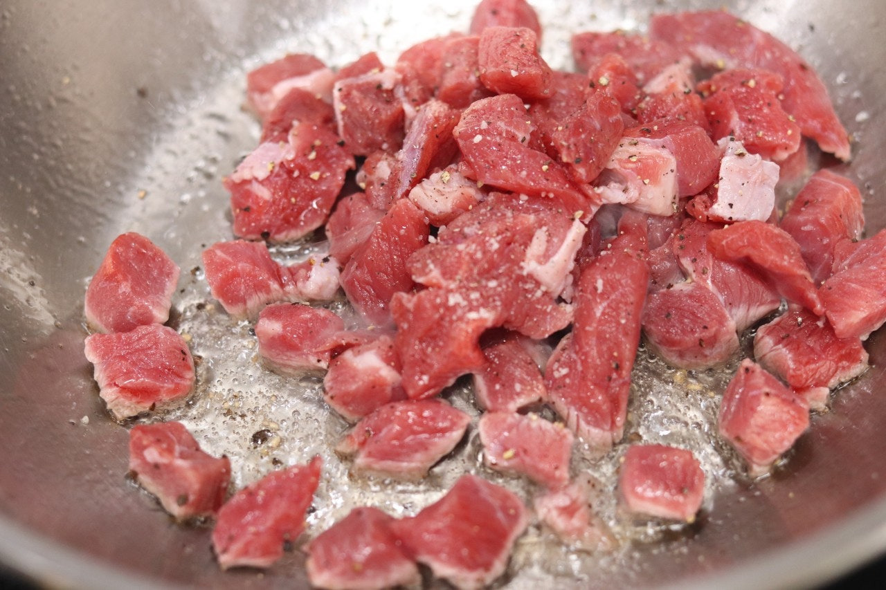 2. 소고기는 핏물을 제거하고 팬에 오일을 두르고 소금, 후추 넣고 볶아 줍니다.