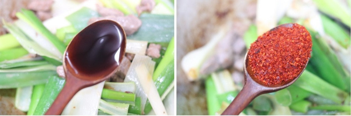 3. 대파를 넣고 볶다가 대파가 숨이 죽으면 홍게간장(국간장) 2T, 고춧가루 2T를 넣고 볶아 줍니다.