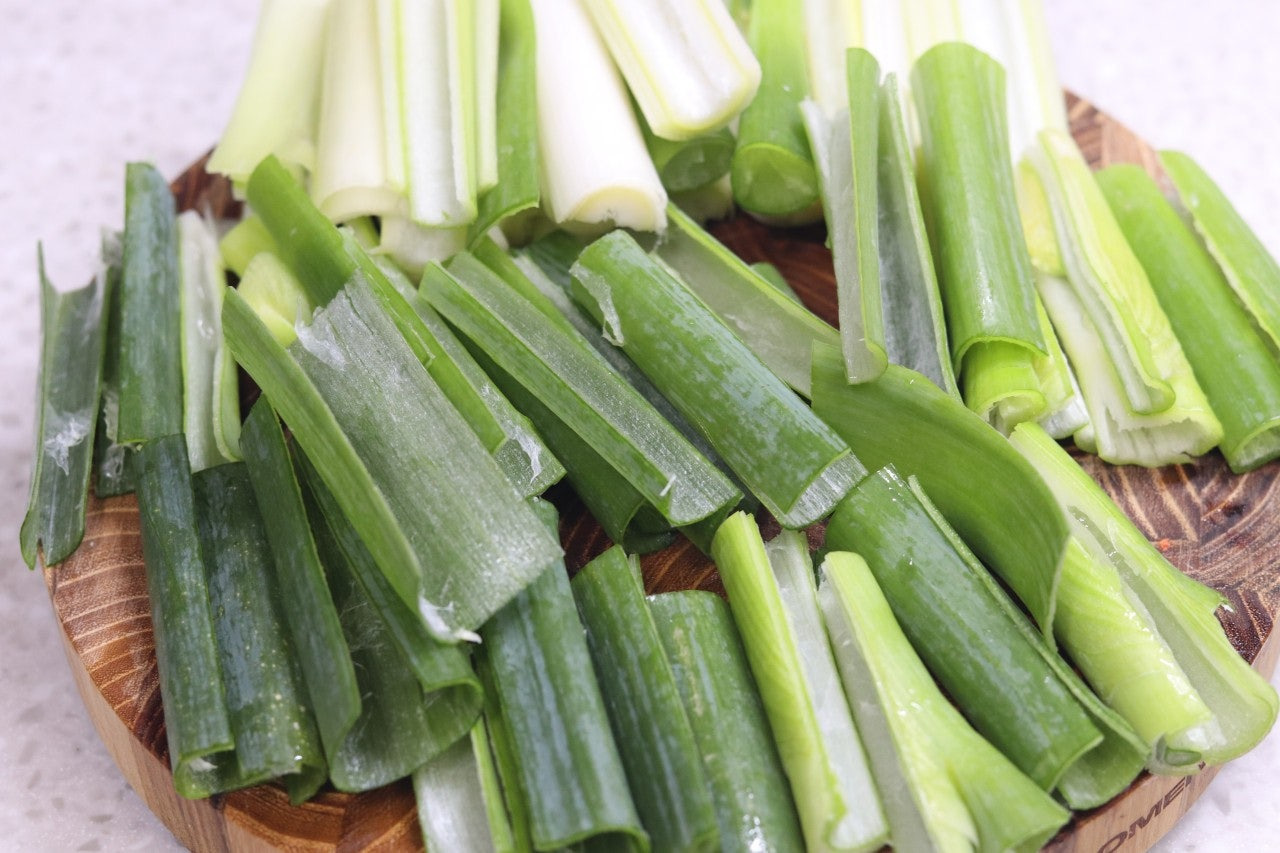 1. 대파를 5cm 길이로 썰어준 후에 반으로 썰어 줍니다.