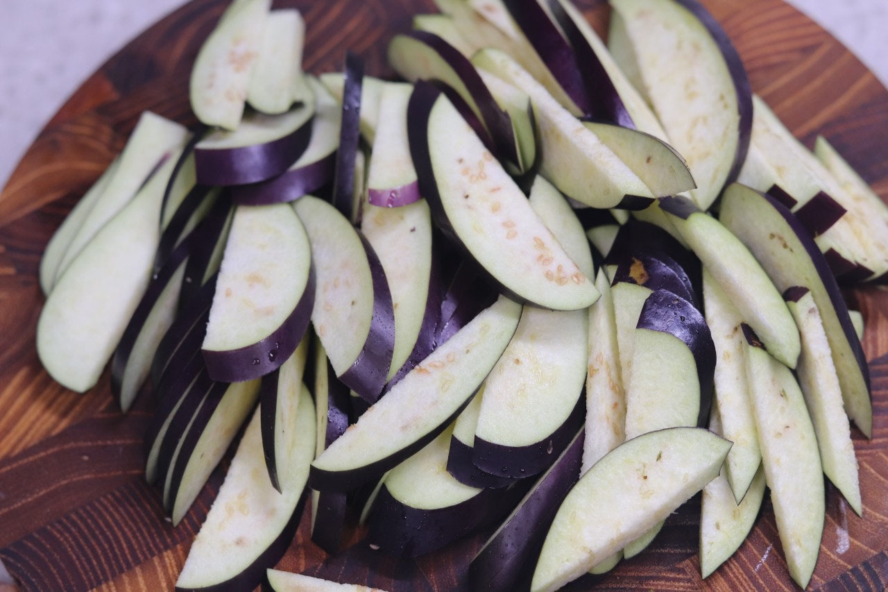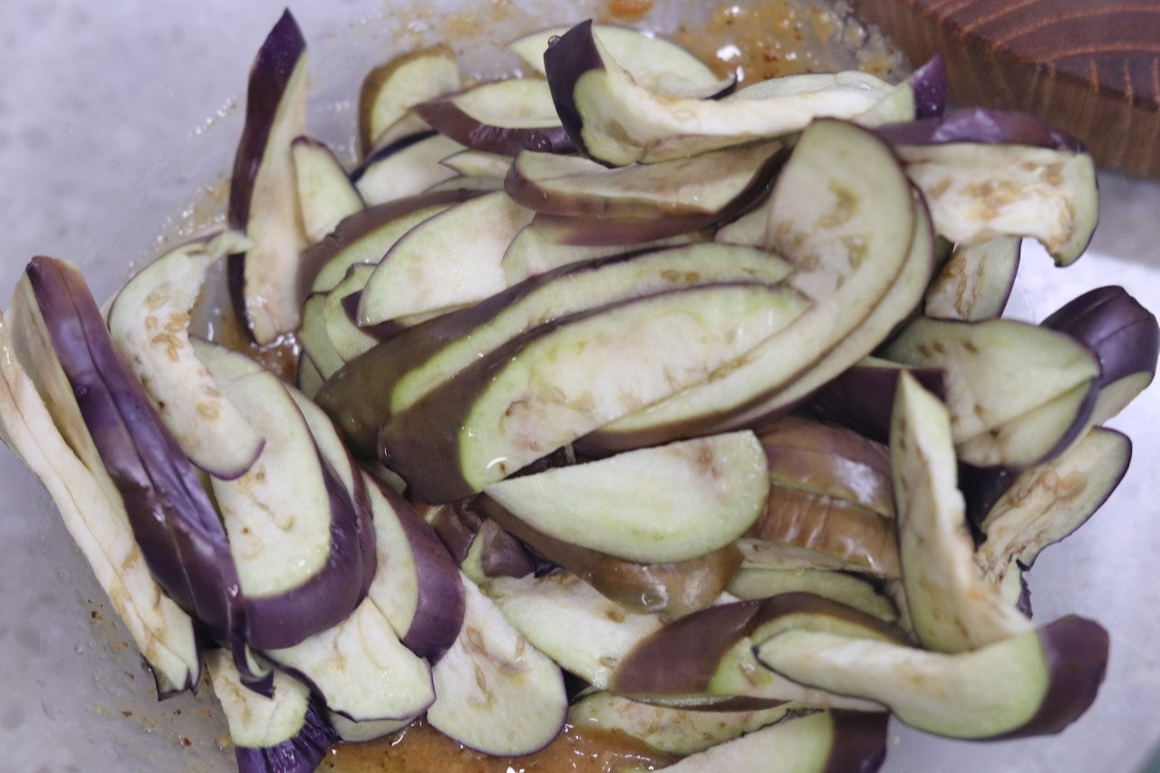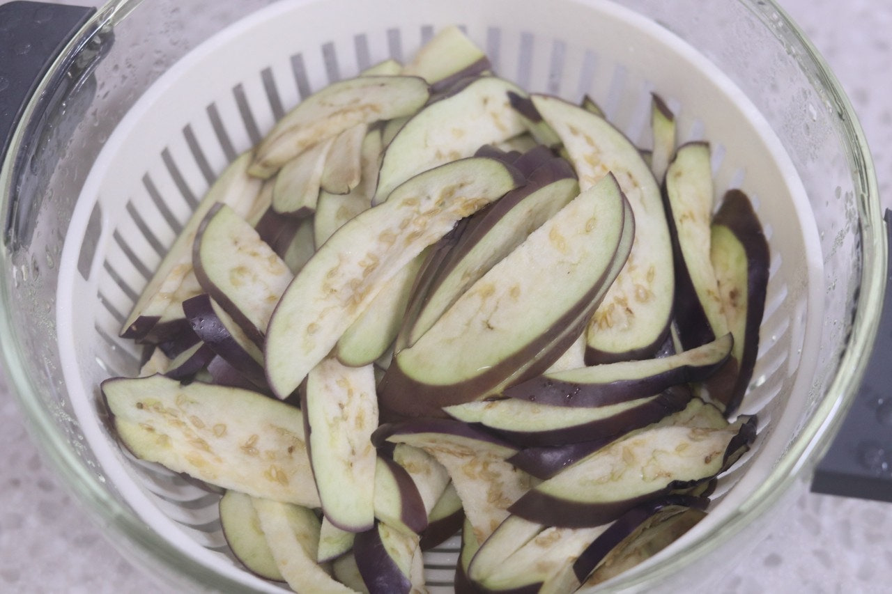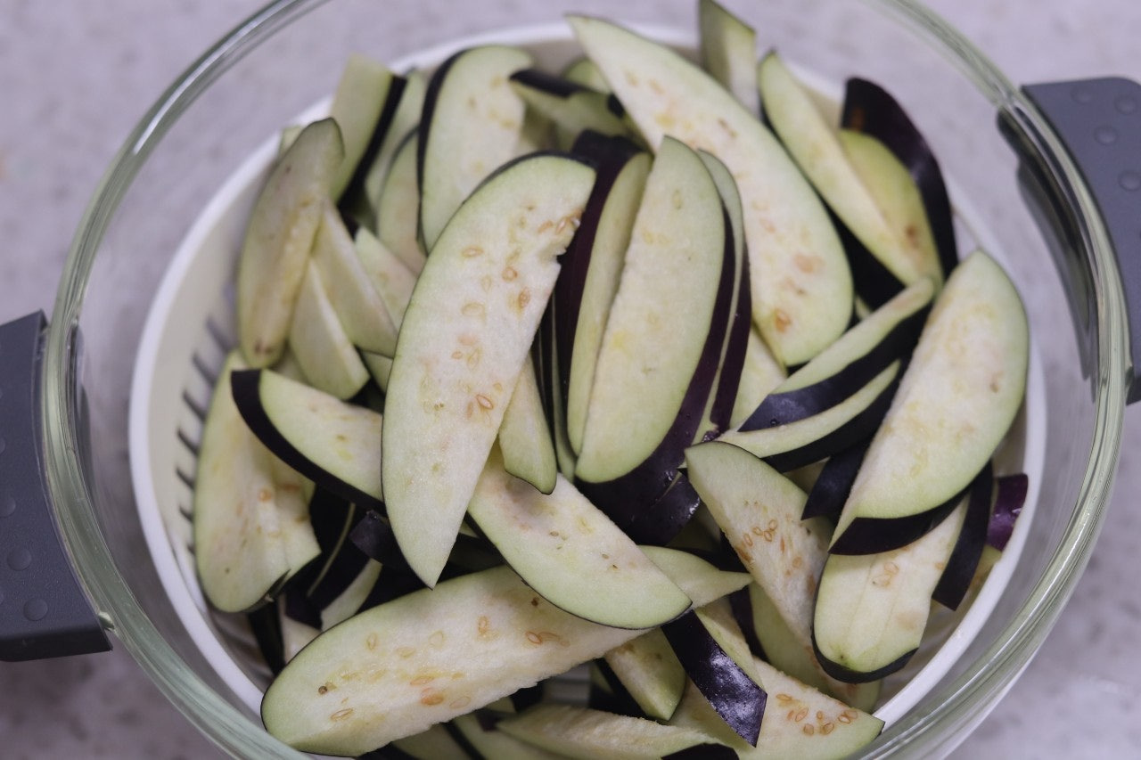 1. 가지는 어슷썰어 전자렌지용기에 넣고 뚜껑닫아 전자렌지에 4분간 쪄줍니다.
