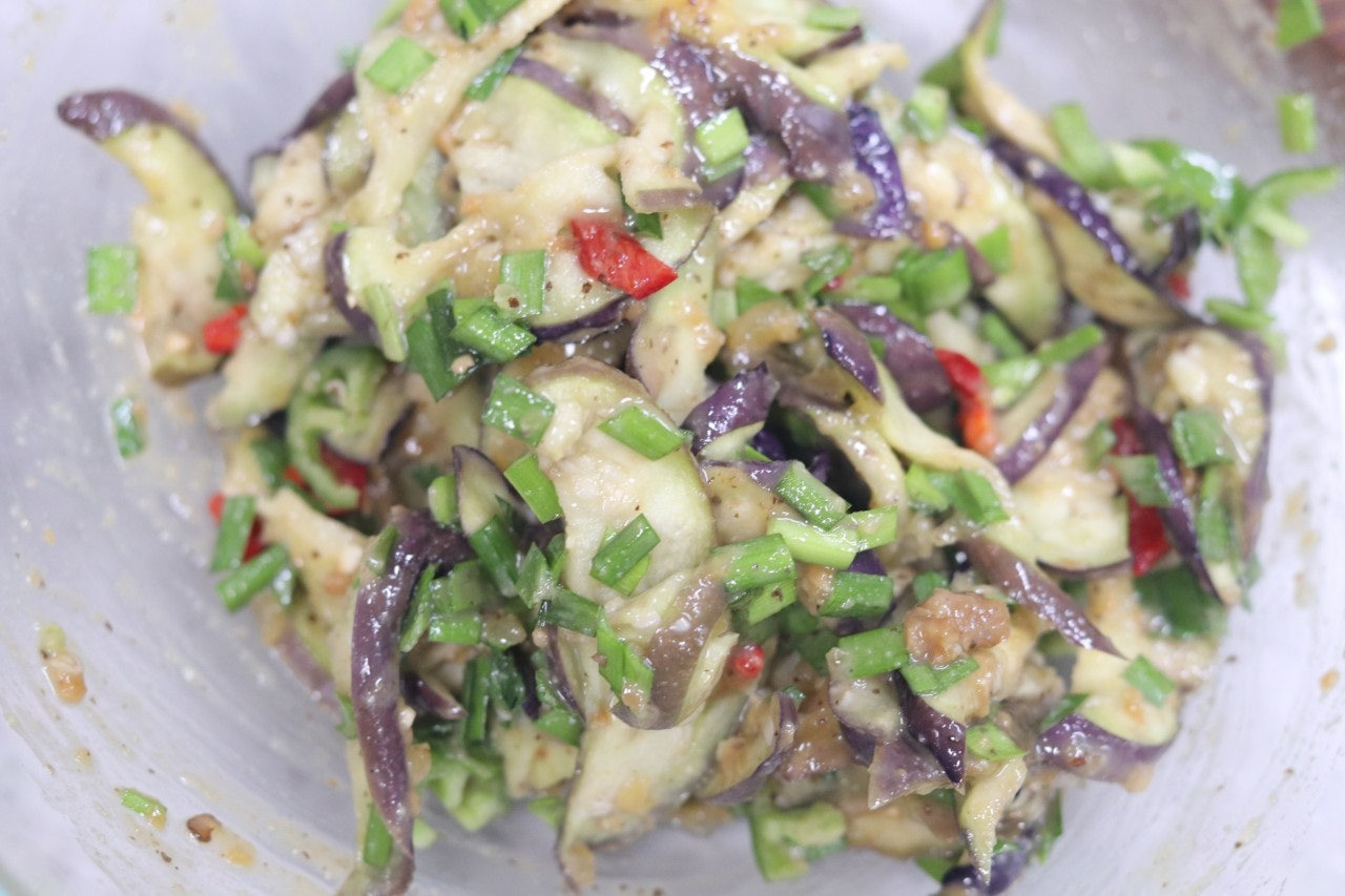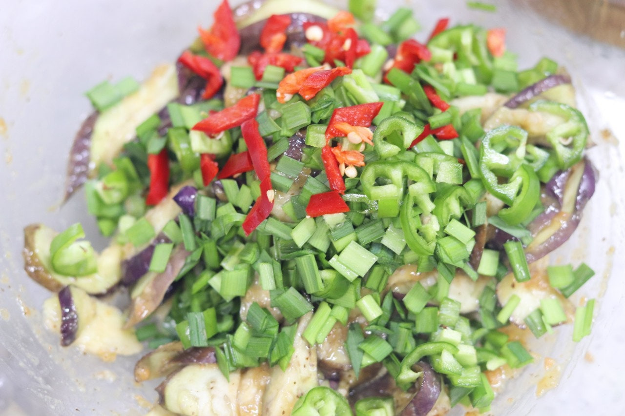 4. 양념에 가지, 부추, 청홍고추 넣고 버무려주면 완성!