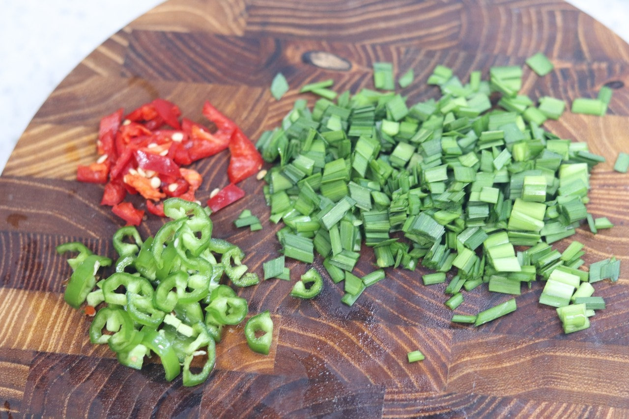 2. 부추, 청홍고추는 잘게 썰어줍니다.