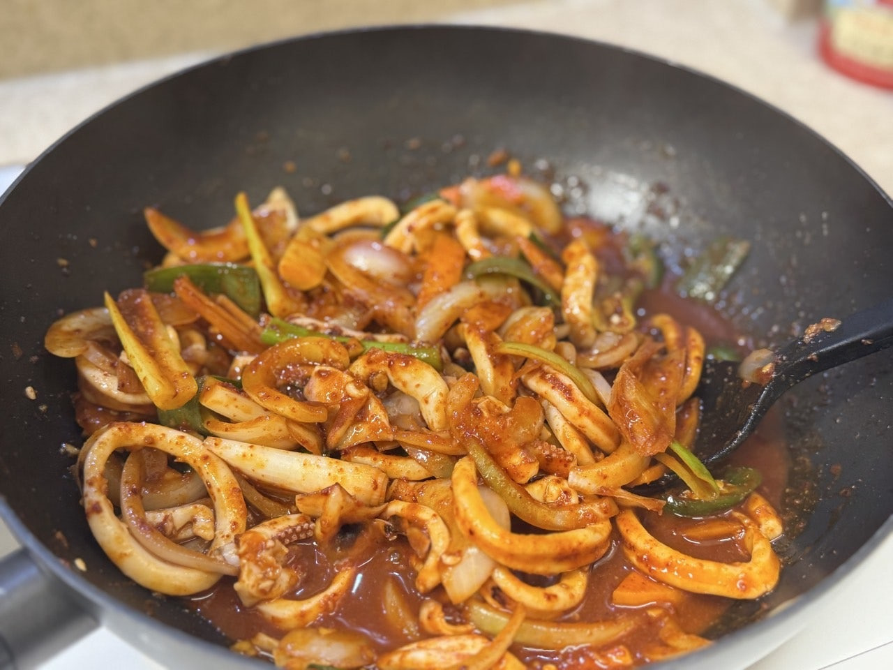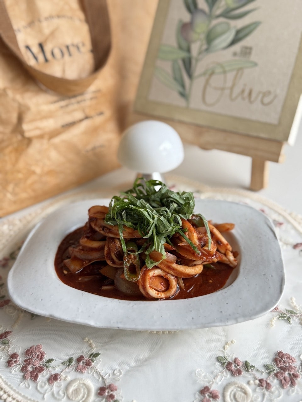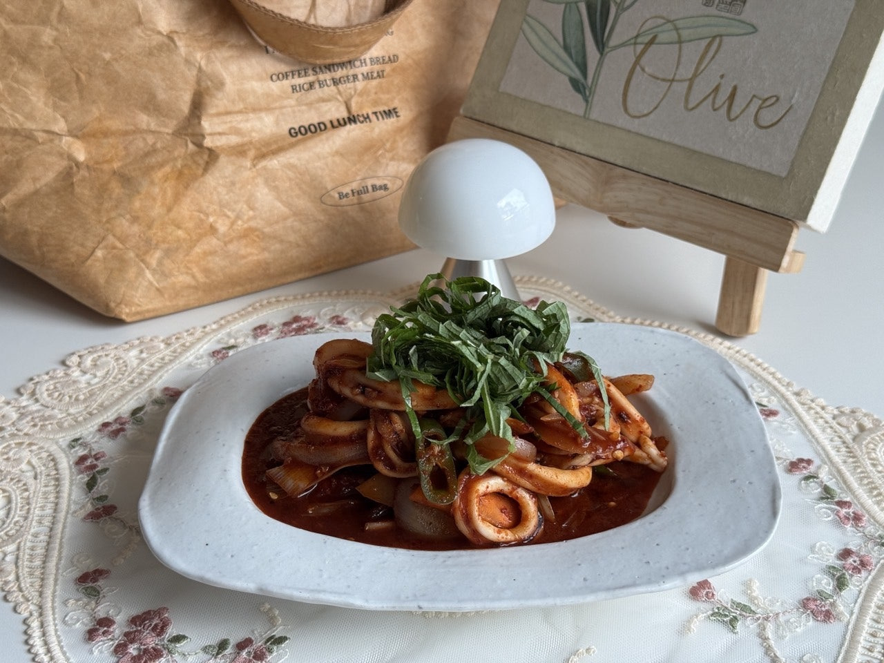 쫄깃한 오징어와 감칠맛 가득한 양념으로