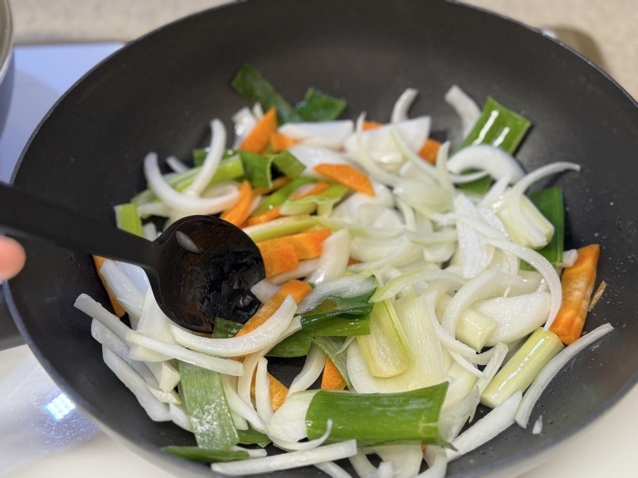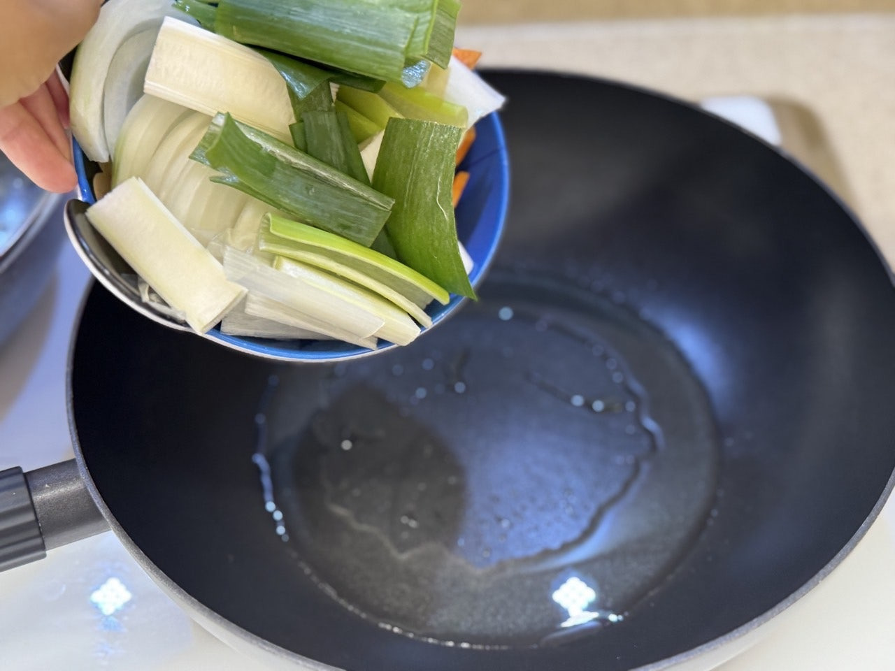 센 불에서 야채 먼저 빠르게 볶아줍니다.