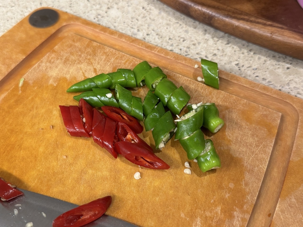 청양고추 2개와 홍고추 한 개 어슷 썰어줍니다.