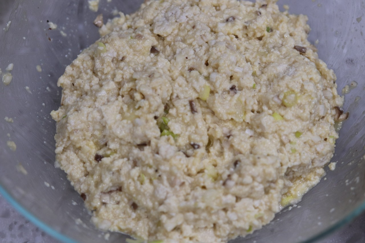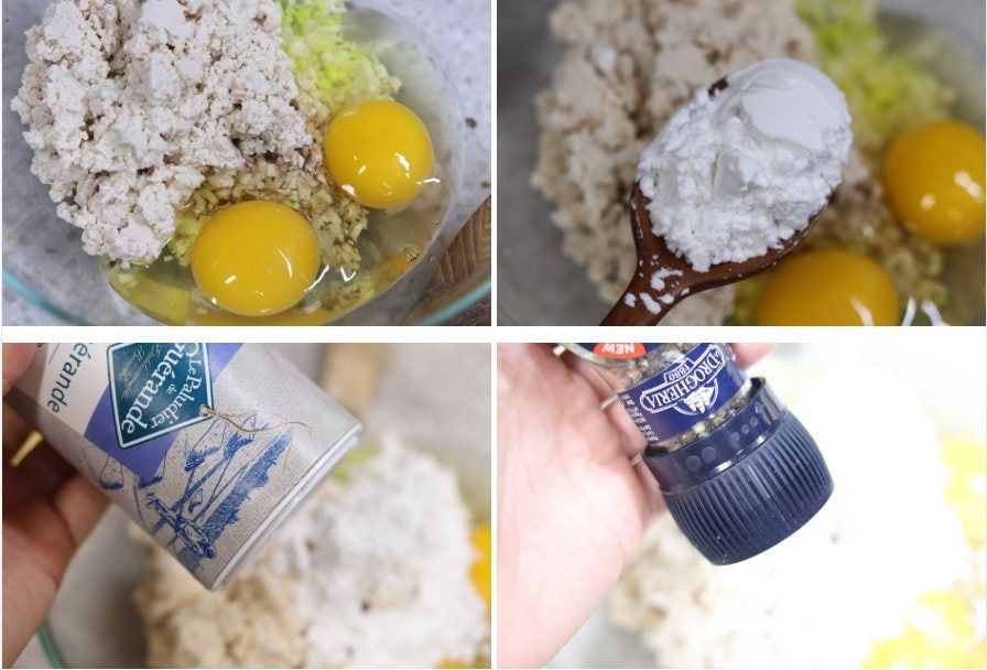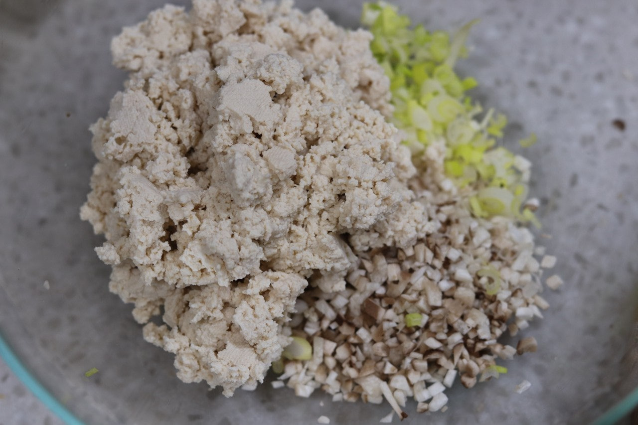3. 볼에 다진 버섯, 대파, 물기 제거한 두부, 달걀 2개, 전분가루 2T, 소금 약간, 후추 약간을 넣고 섞어 두부 반죽을 만들어 줍니다.