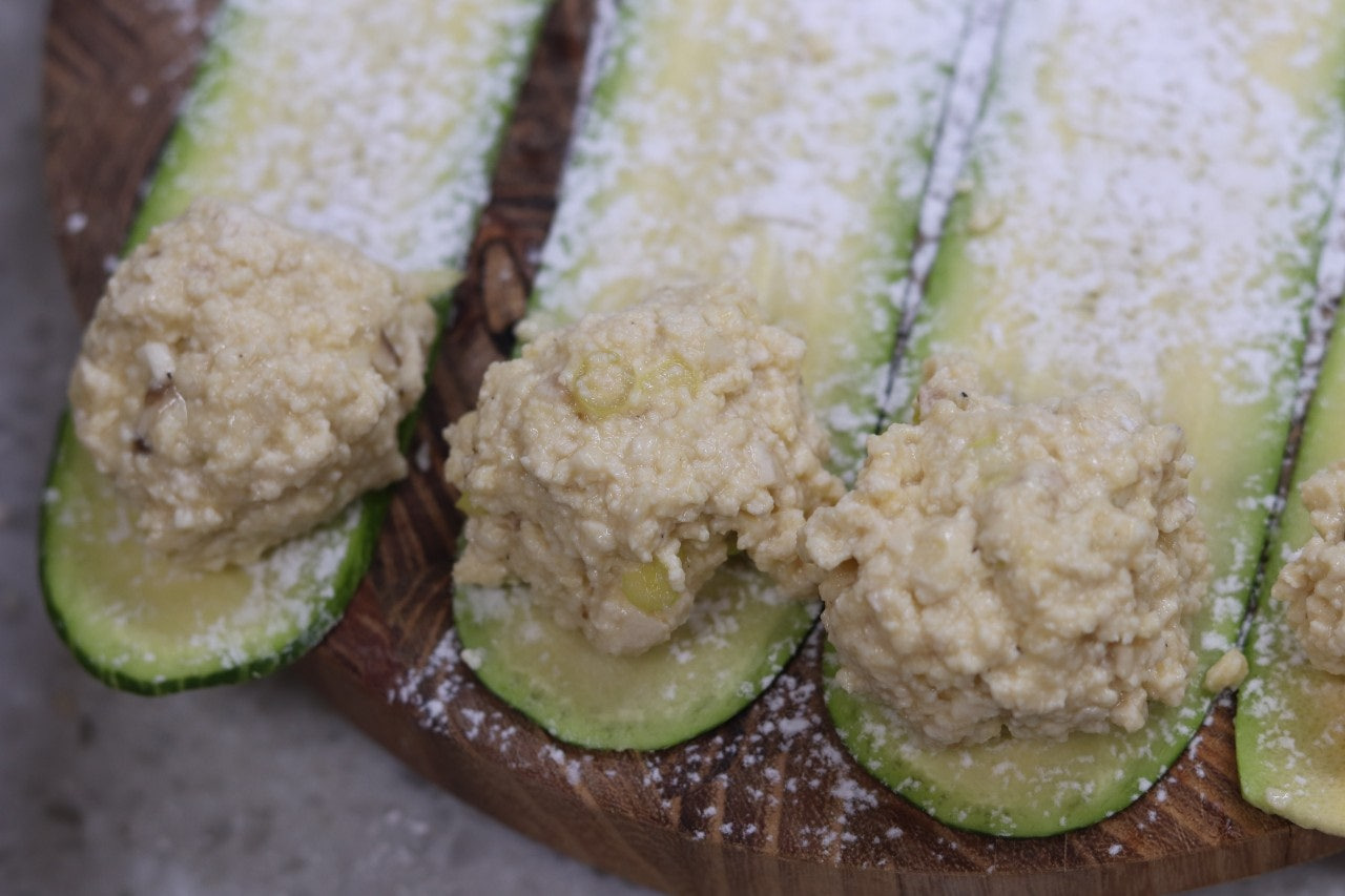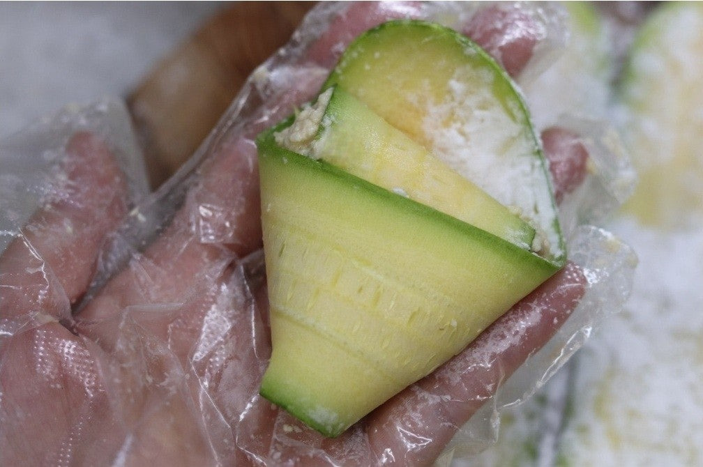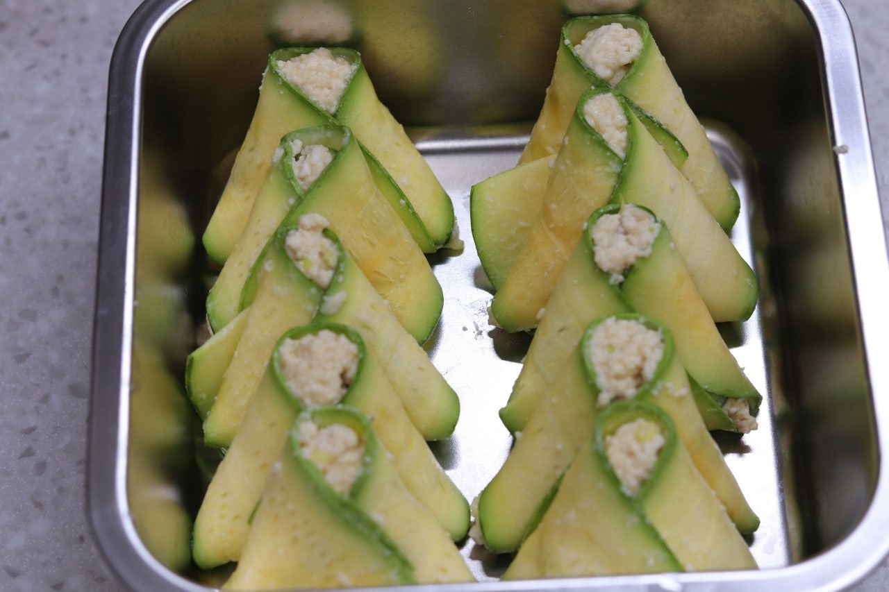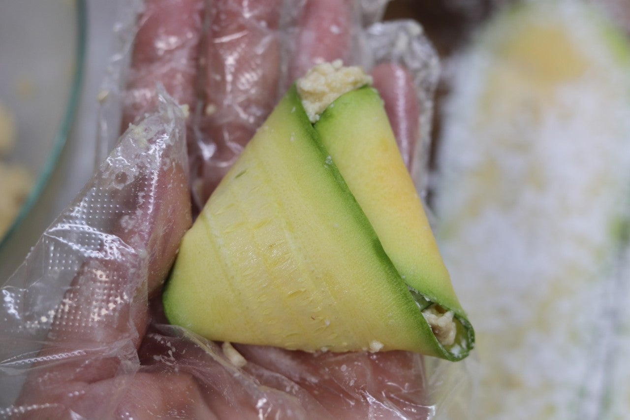 5. 애호박 위로 반죽을 탁구공 크기만큼 올려준 후에 삼각형으로 접어줍니다.