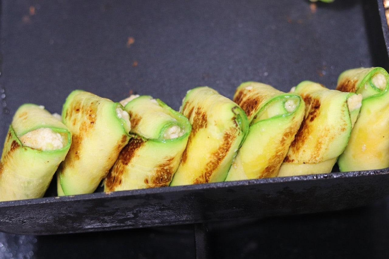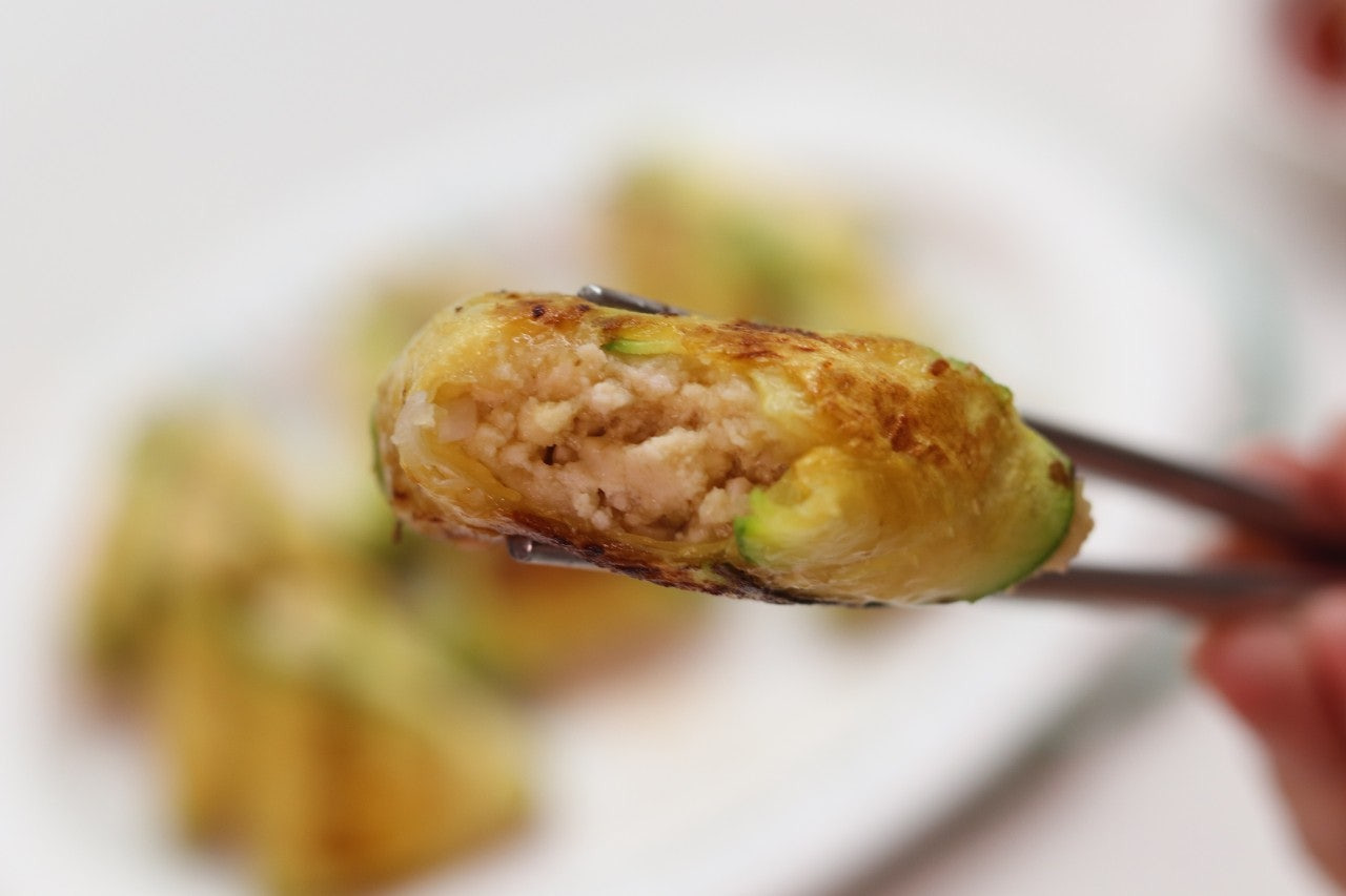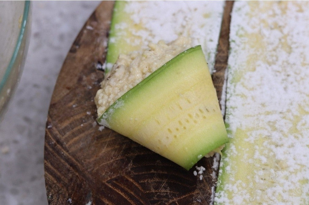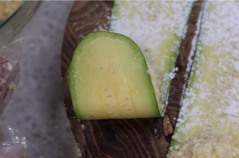 5. 애호박 위로 반죽을 탁구공 크기만큼 올려준 후에 삼각형으로 접어줍니다.