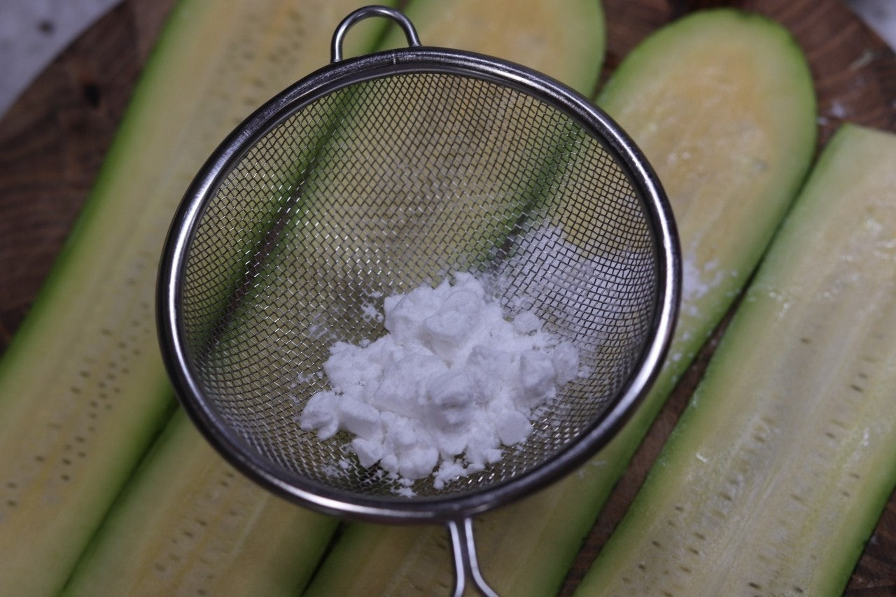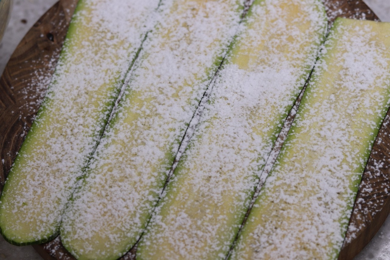 4. 애호박의 물기를 닦고 위로 전분가루를 뿌려 줍니다.
